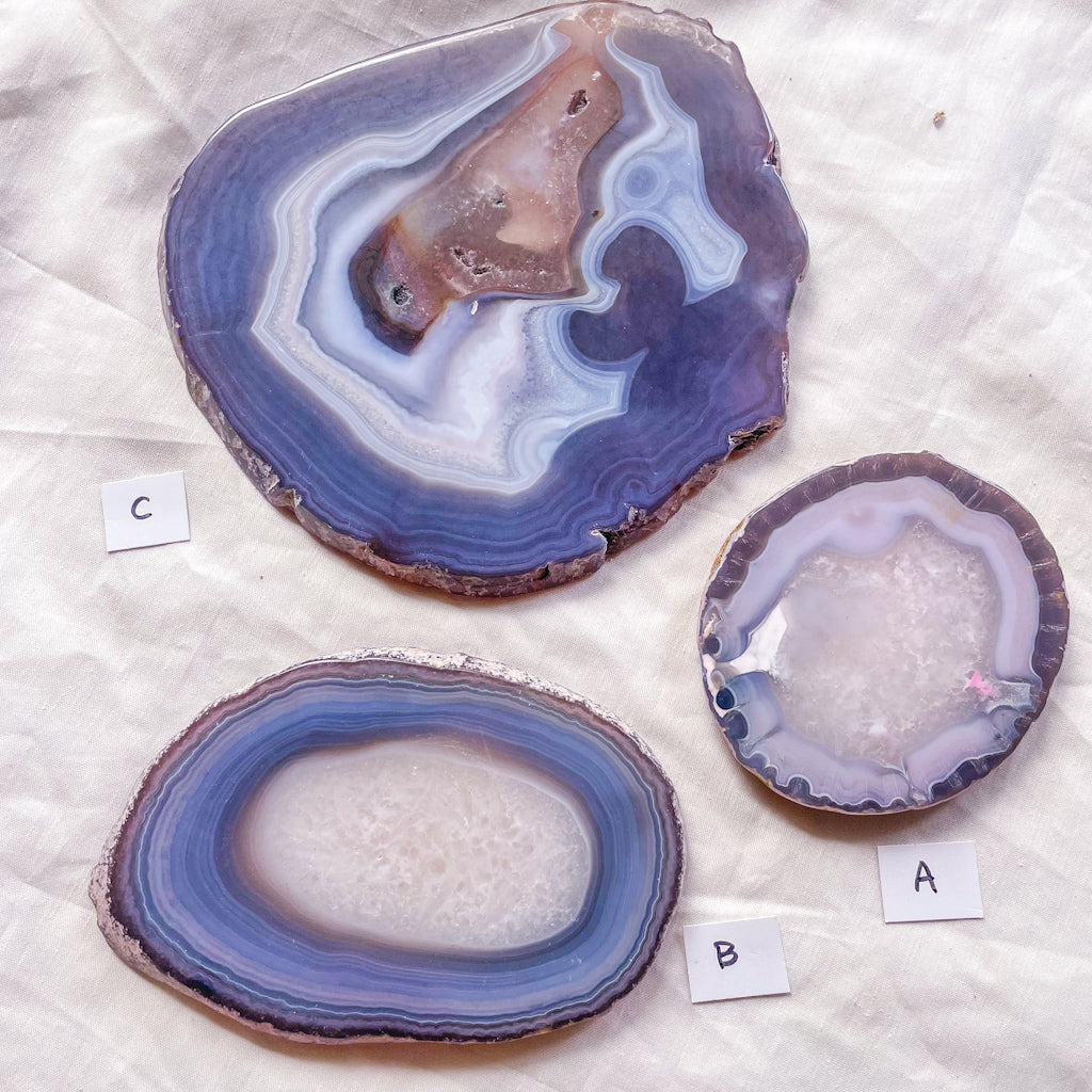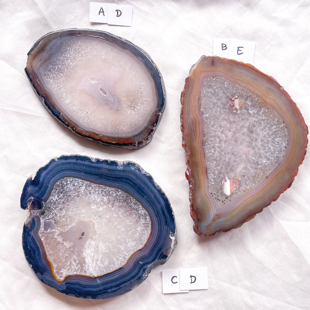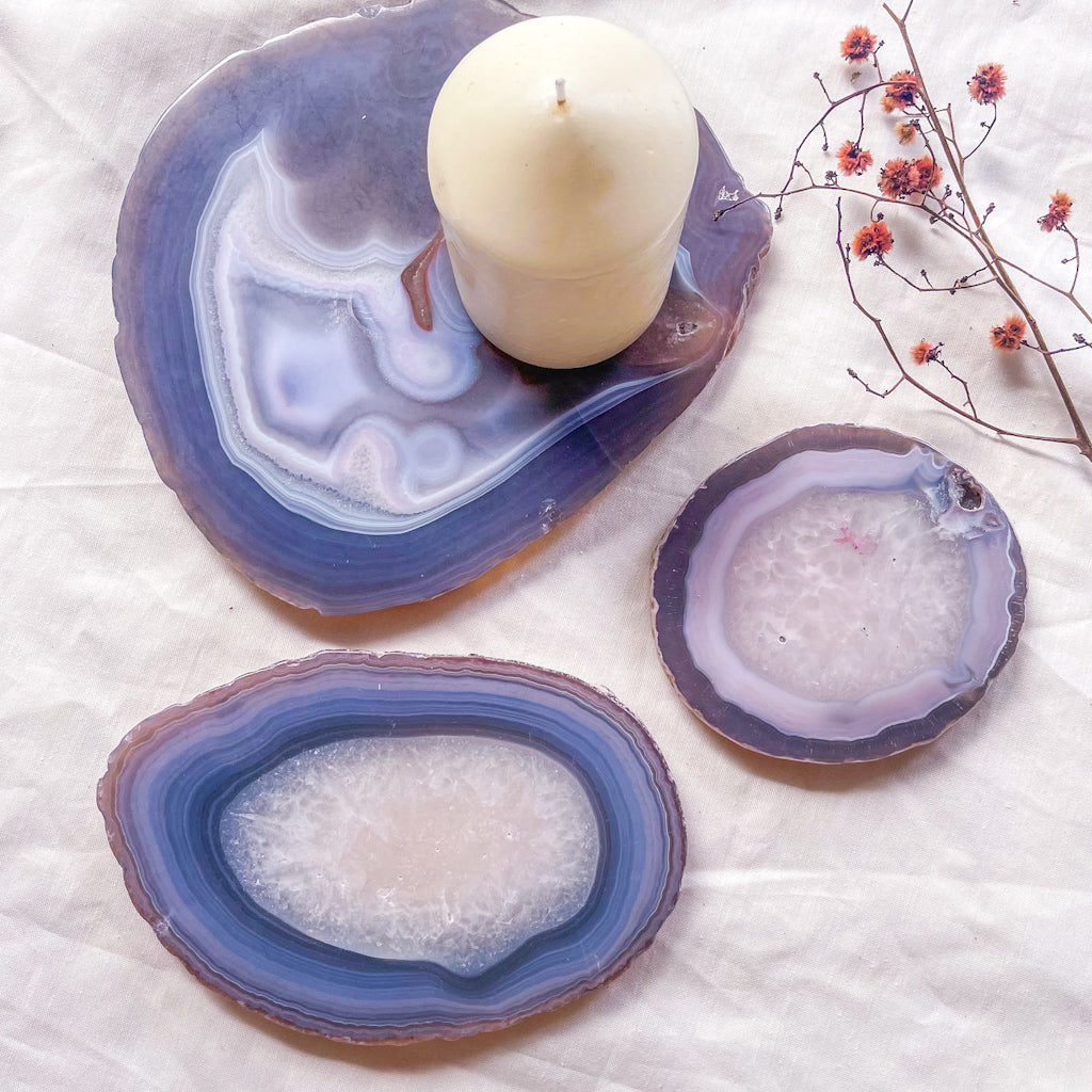 These crystal agate thick slabs are the most beautiful natural gift. A great desk accessory, a spot for keys by the door, or a ring dish by your bedside. Use it as a coaster to infuse your drink with good crystal energy.