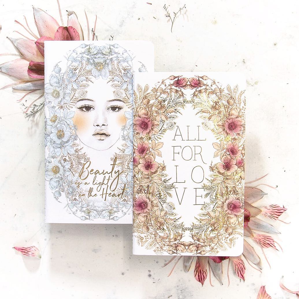 You can write down your love notes to your sweetheart in the All for Love staple notebook set. This set features 2 notebooks, one with a pink floral design, with the words "All for Love" in gold letters, the other with a woman's face surrounded by white and yellow flowers with the words "Beauty is a Light for the Heart" in gold letters.