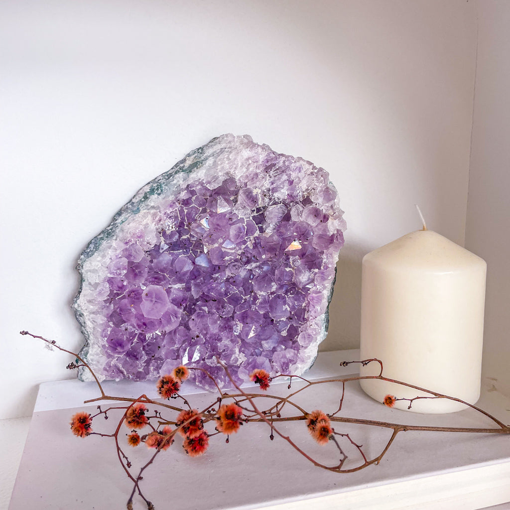 A beautiful extra large piece of amethyst crystal that makes a gorgeous statue for your coffee table.