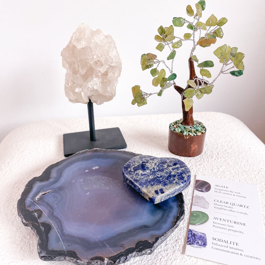 This crystal set includes 4 large crystals in a gift box: Sodalite heart shaped crystal stone, Clear quartz crystal cluster on metal stand, Agate tray for rings, candle or coaster and Green aventurine crystal tree.