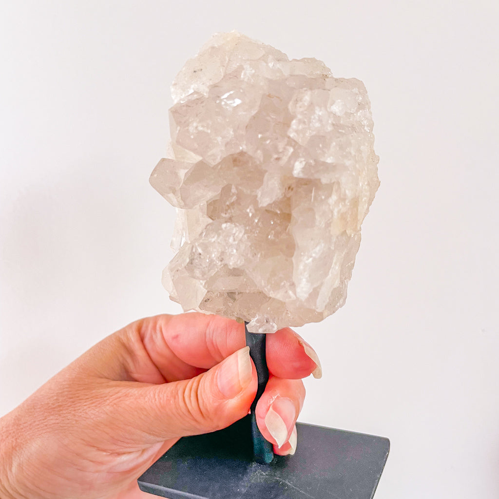 - Clear quartz crystal cluster on metal stand 13cm valued at $95