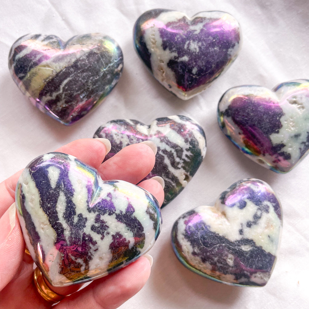 Rainbow pinky iridescent patterned puffy crystal hearts perfect for admiring in the light.