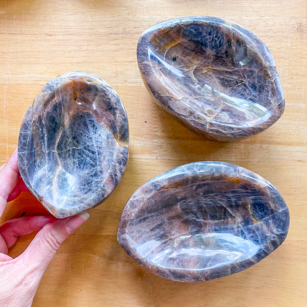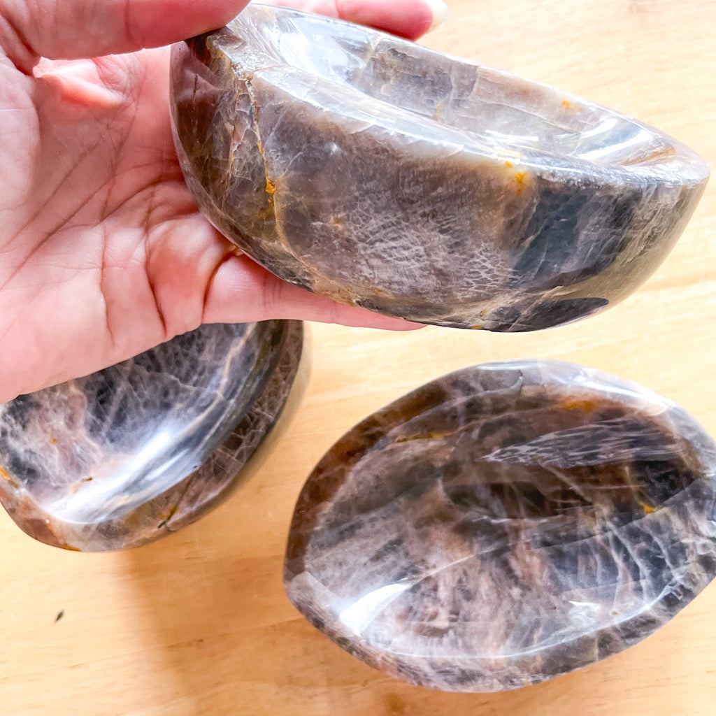 These beautiful black moonstone crystal bowls will melt your heart and look gorgeous on your vanity or table.