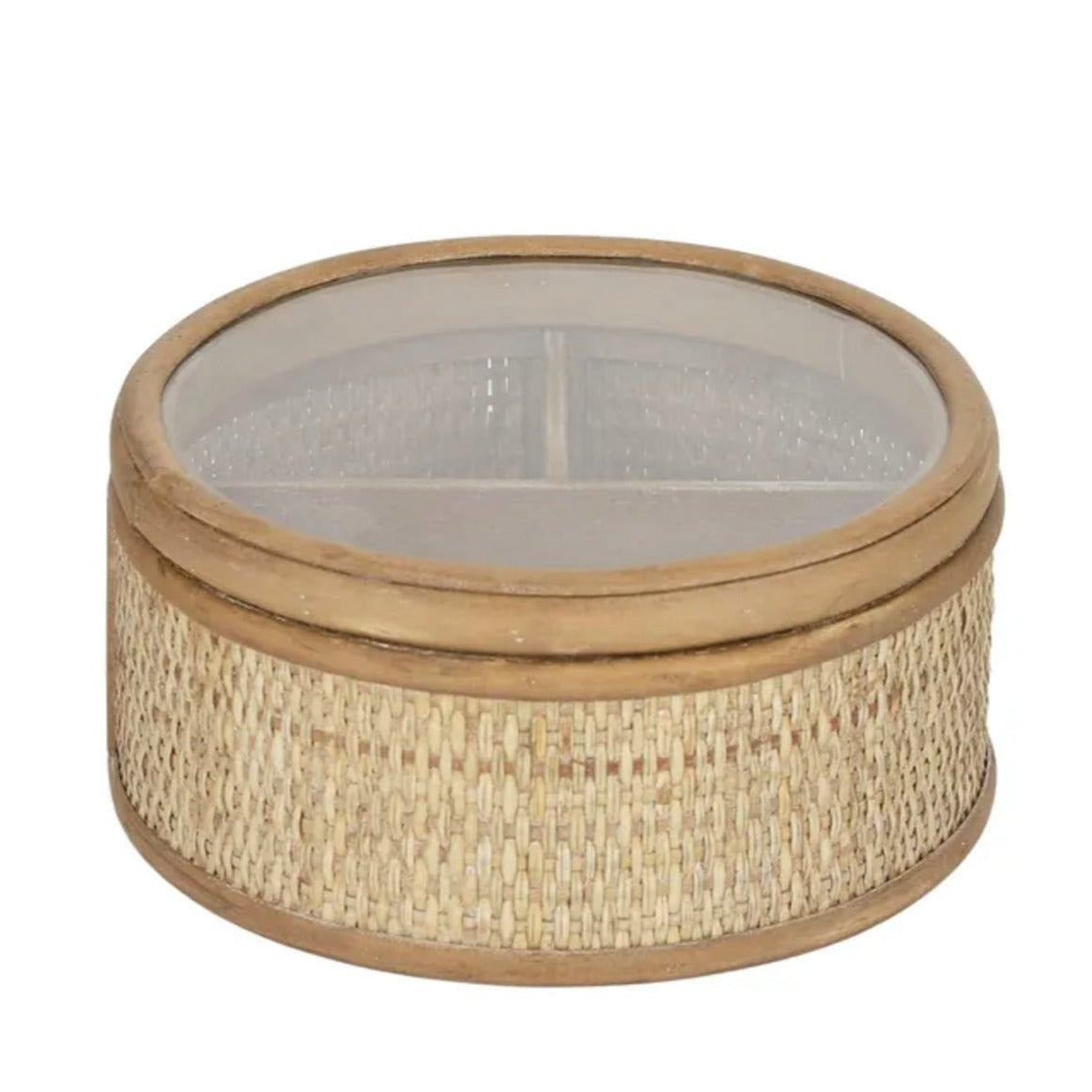 Our stylish Jewellery Box is made from woven rattan and timber, it features a glass viewing lid with compartments for storage.
