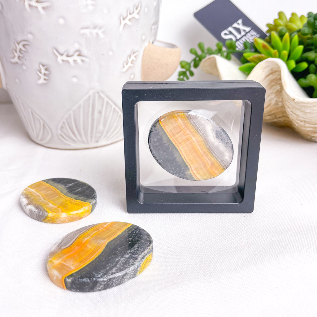 Purchase Bumblebee jasper crystal palm stone, coin or tumble online now from Six things shop Australia.