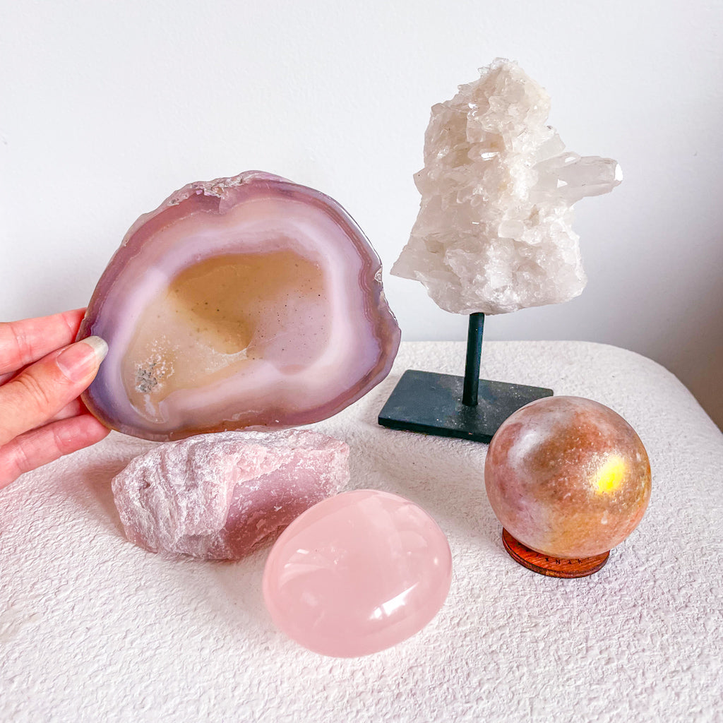 This crystal set includes 5 large crystals in a gift box: Pink opal raw crystal stone, Clear quartz crystal cluster on metal stand, Agate tray for rings, candle or coaster and rose quartz palm stone and aura jade sphere.