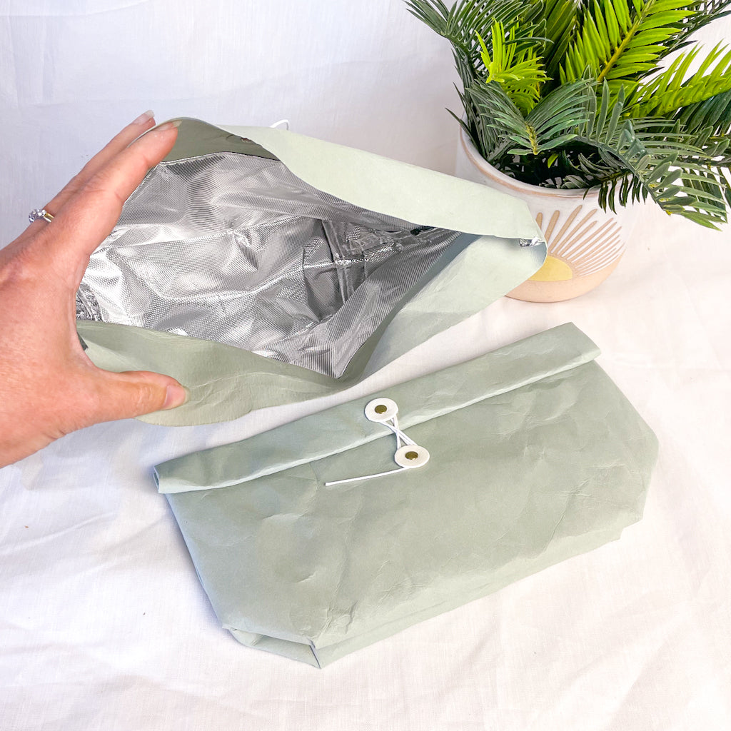 Handy bag made out washed paper with an inner lining of cooler material to keep items fresh.