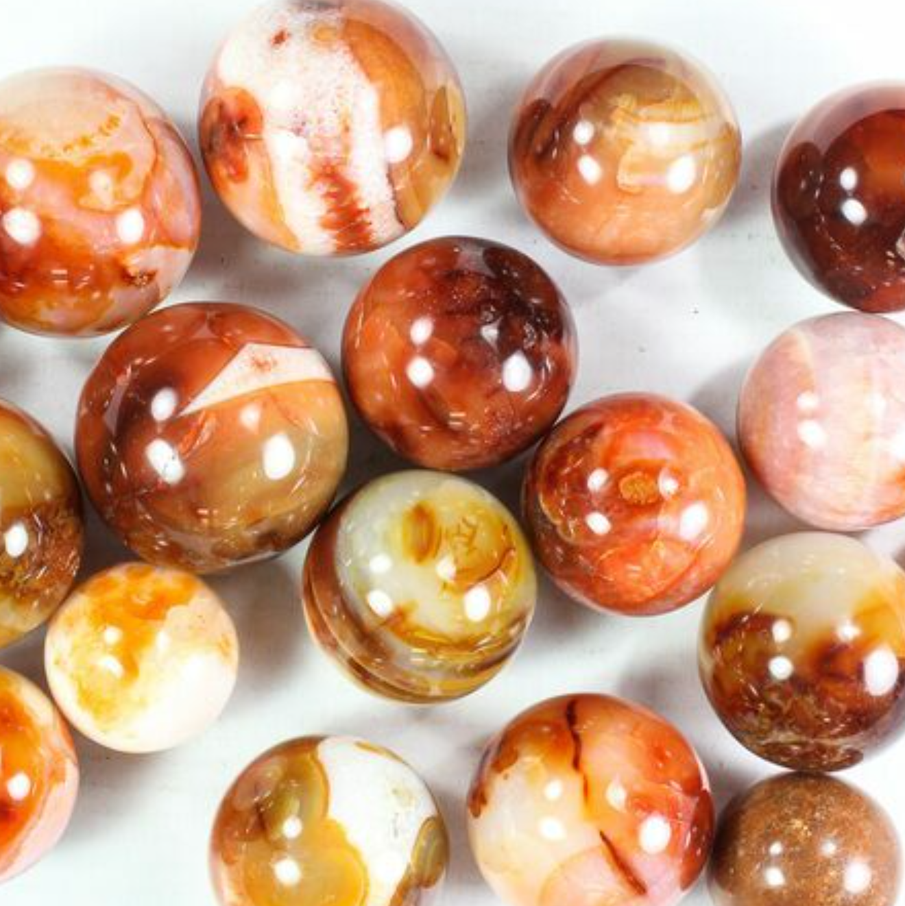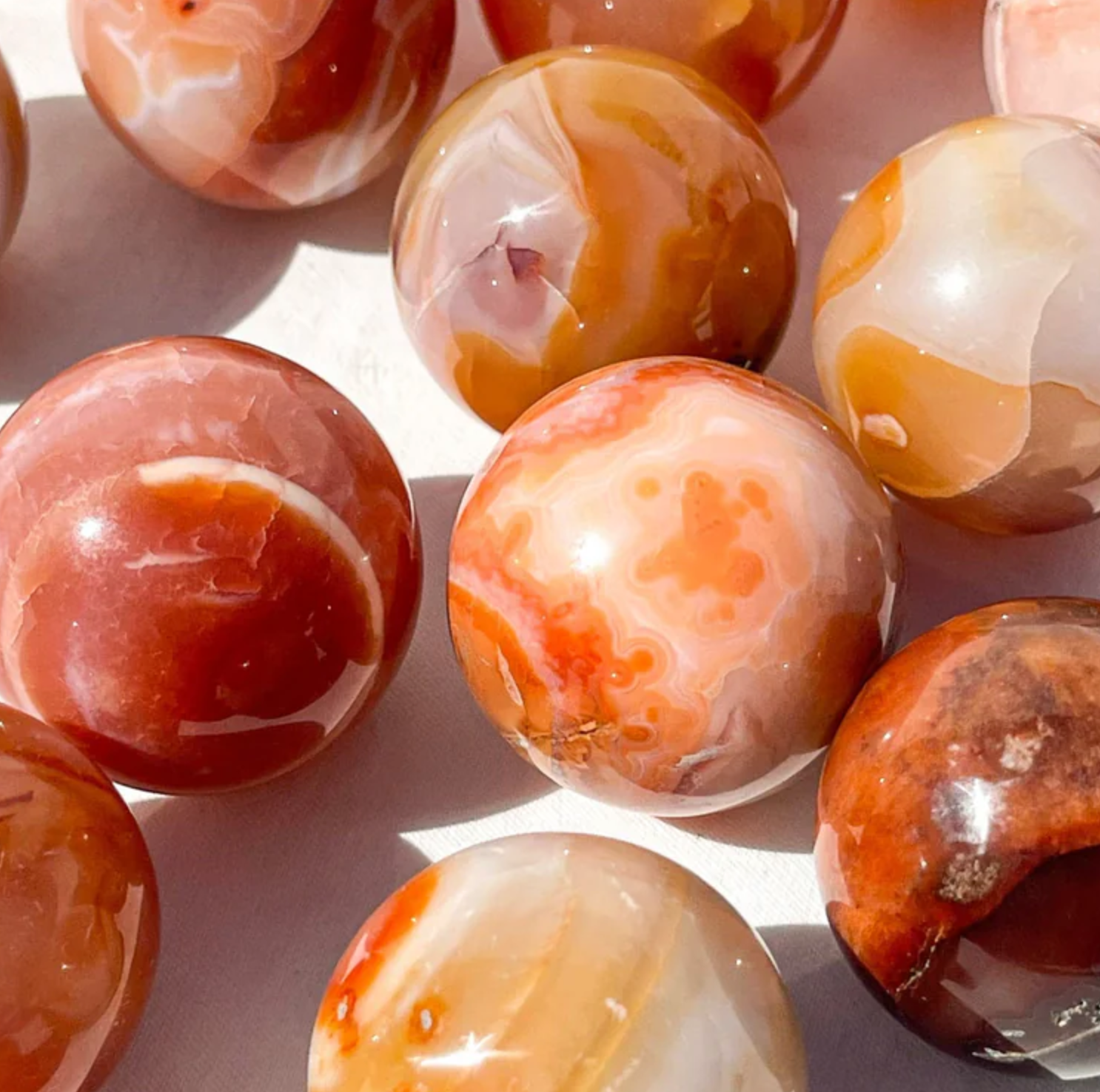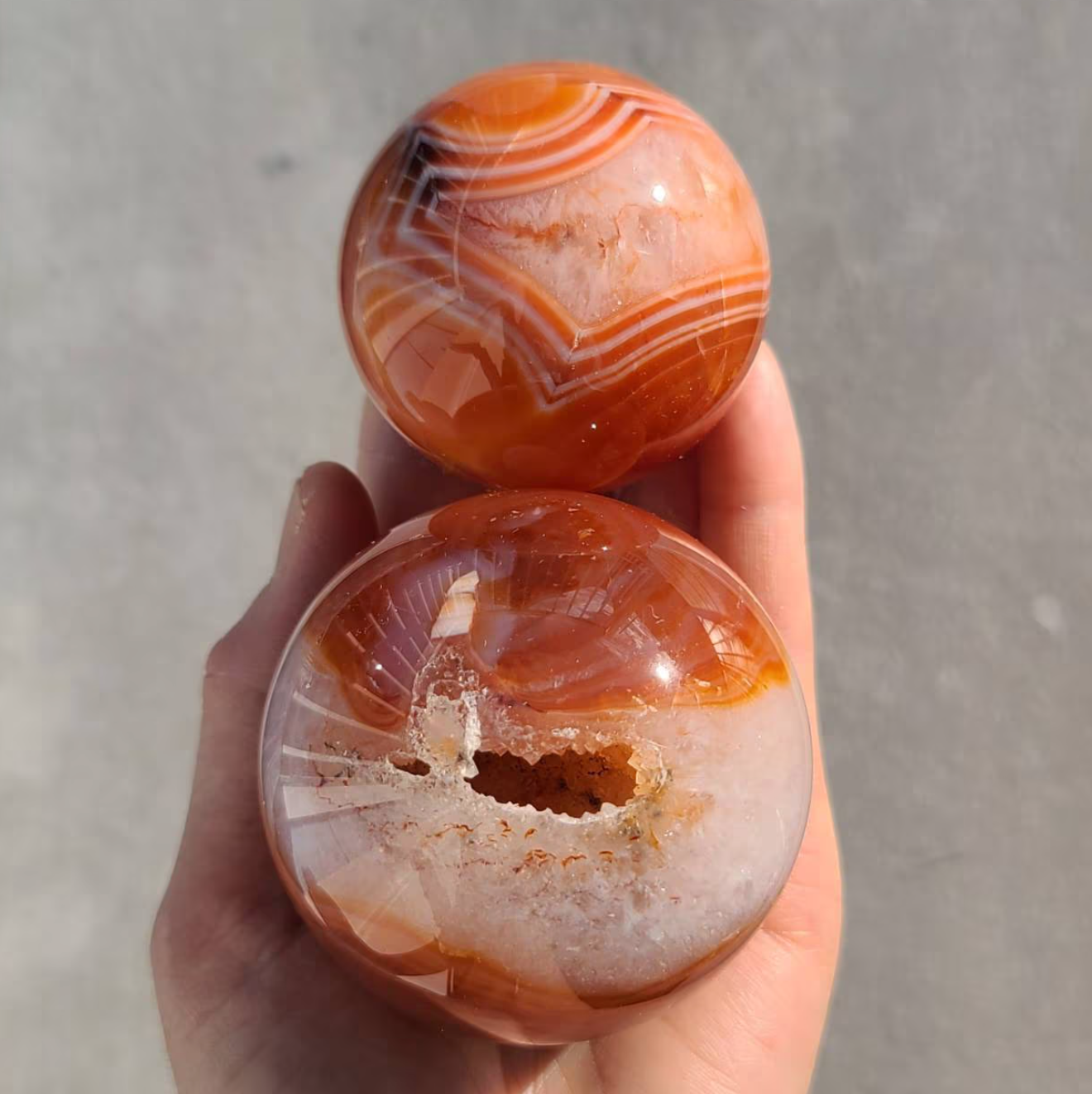 As the stunning red and oranges seem to blend and swirl together, each piece of Carnelian is not only stunning but entirely unique. Some spheres also boasts beautiful shimmering druzy caves.