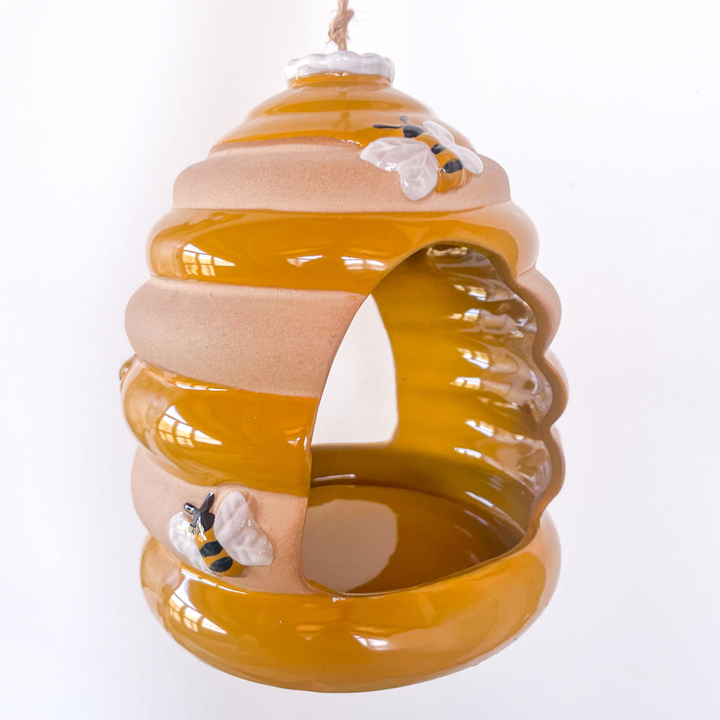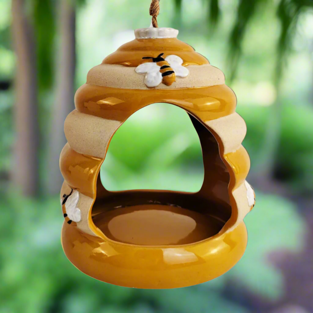 Sweet and decorative, this charming ceramic bird feeder provides shelter for feeding birds. Shaped just like a beehive, simply sprinkle nuts and seeds in the bottom of the beehive, and garden birds can perch on the edge or inside to enjoy healthy, nutritious snacks.