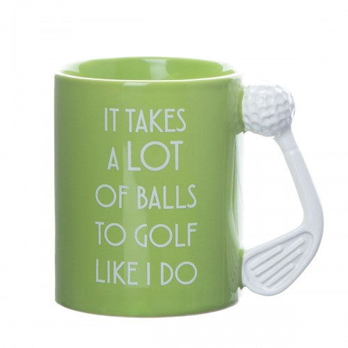 Putt’ the kettle on and make a ‘tee’ in this hilarious golf mug. This fun mug is dishwasher and microwave safe, and holds 10oz. With text which reads “It Takes a Lot Of Balls To Golf Like I Do” and complete in a decorative gift box, this is the perfect present for a birthday, Christmas or father’s day. Greener than the golf course with a detailed ball and club handle, this ceramic mug is the ultimate gift for a golf fanatic. The question is, How many balls DOES it take to golf like you do?