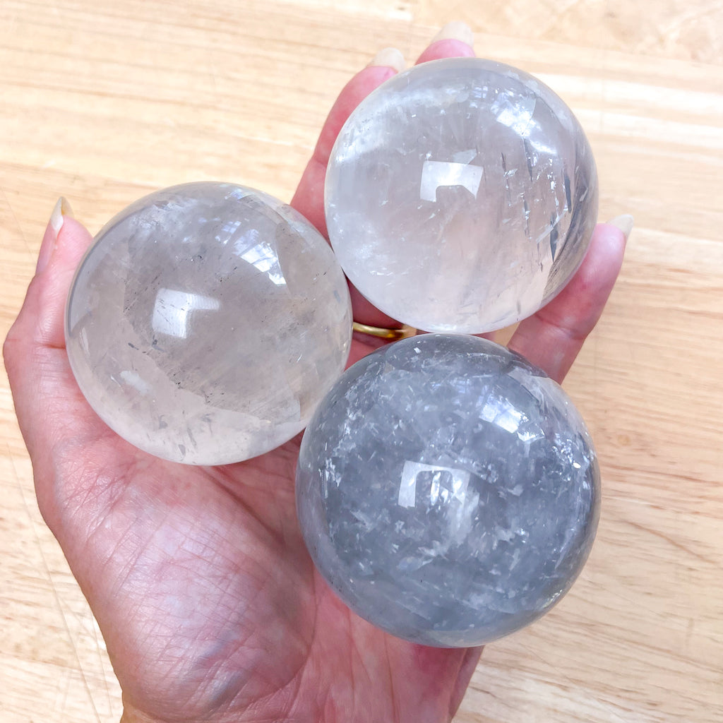 Crystal spheres elegantly display the beautiful qualities of clear optical calcite crystals with gorgeous patterns and rainbows throughout. Perfect for your witchy decor or to add sparkly by the window.
