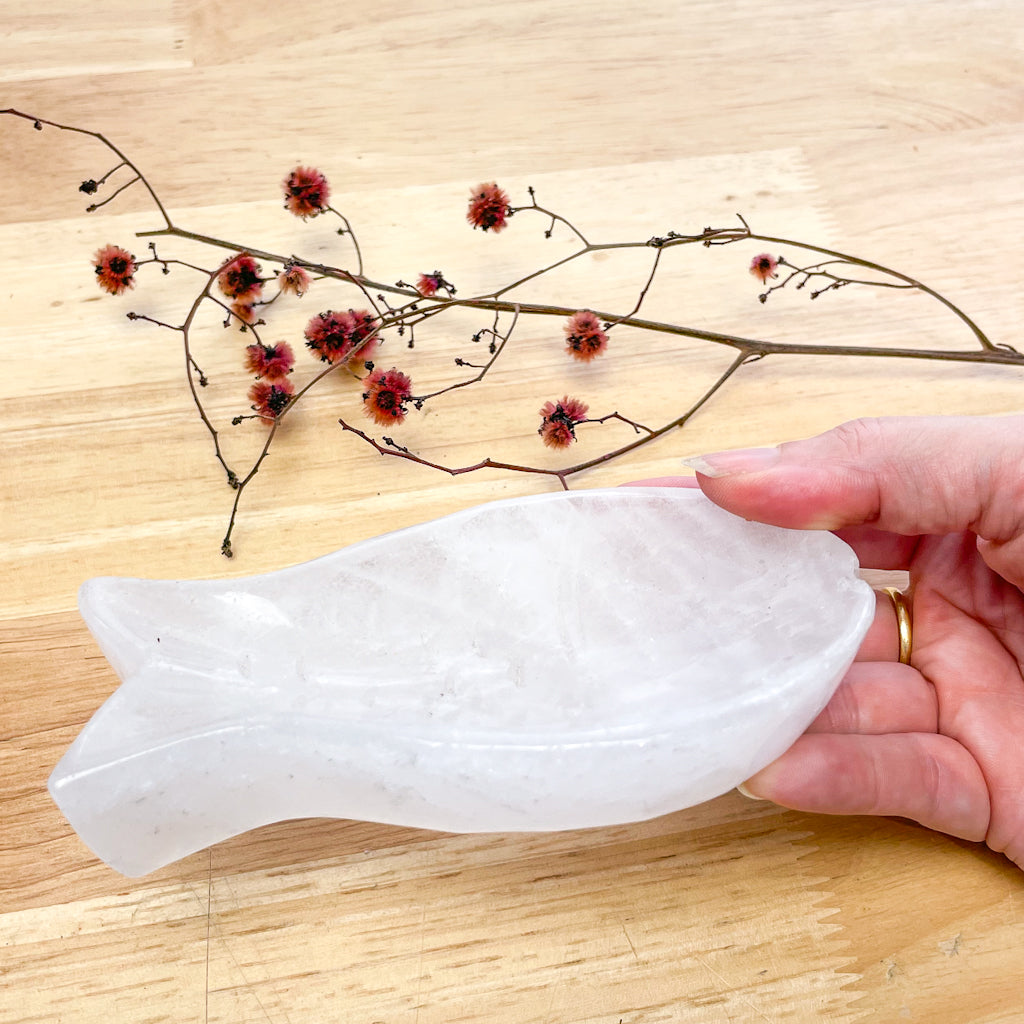 Purchase Clear quartz crystal fish shaped carved bowl online now from Six things shop Australia.