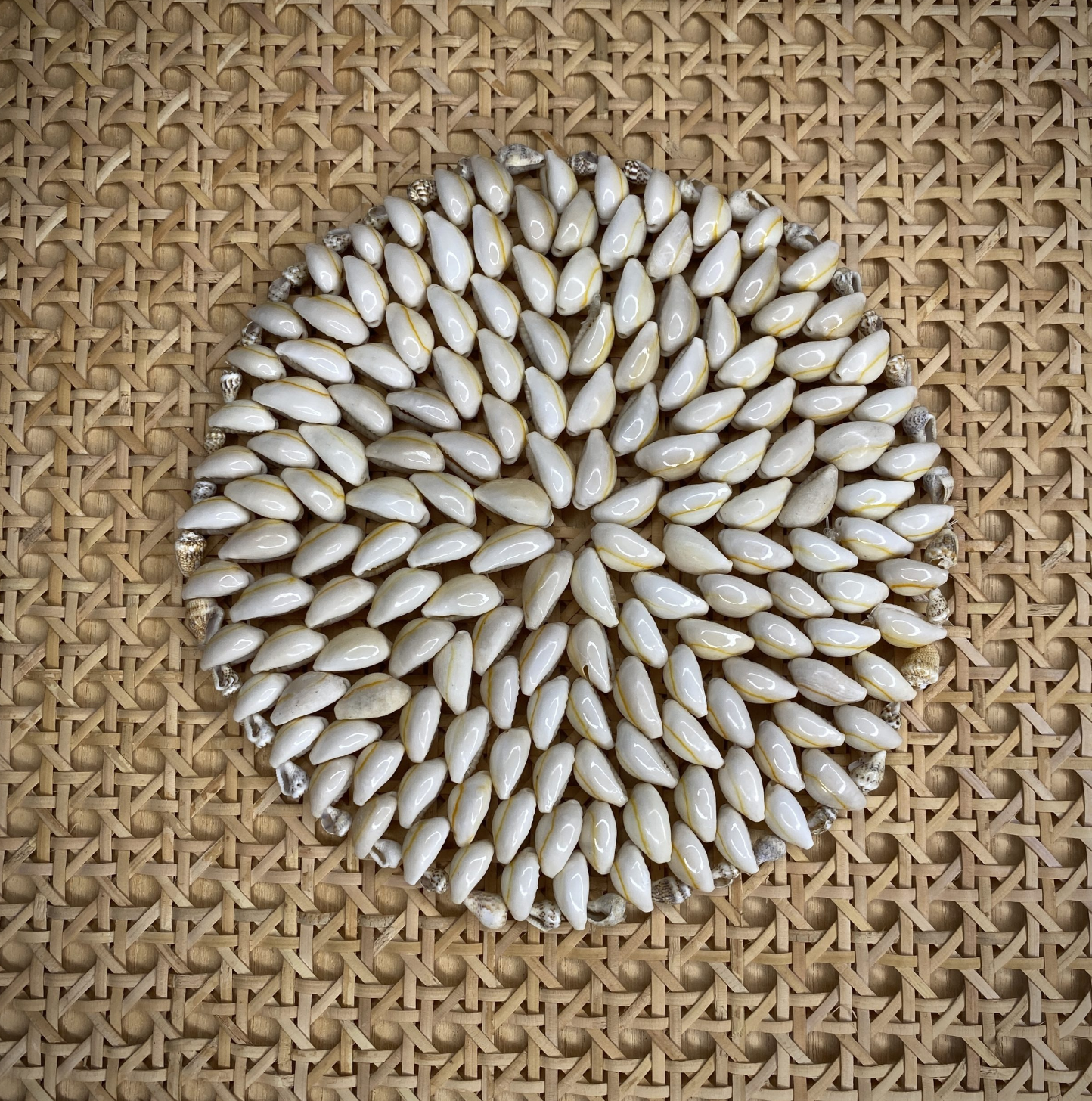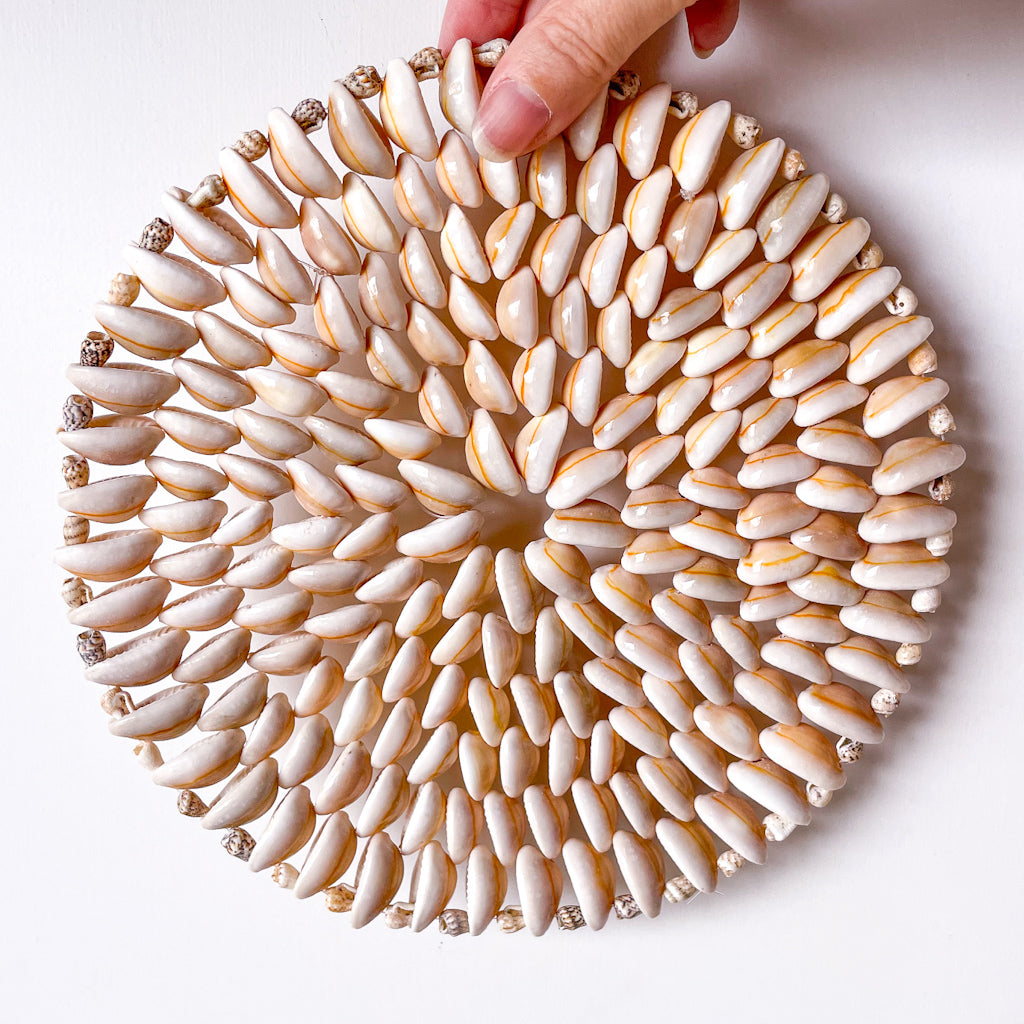 These stunning cowrie shell placemats make a beautiful centerpiece on a dining or coffee table. Made from natural coloured cowrie shells on the body of the placemat, with tiny white shells accented around the edge of each piece. A beautiful addition to a coastal home.