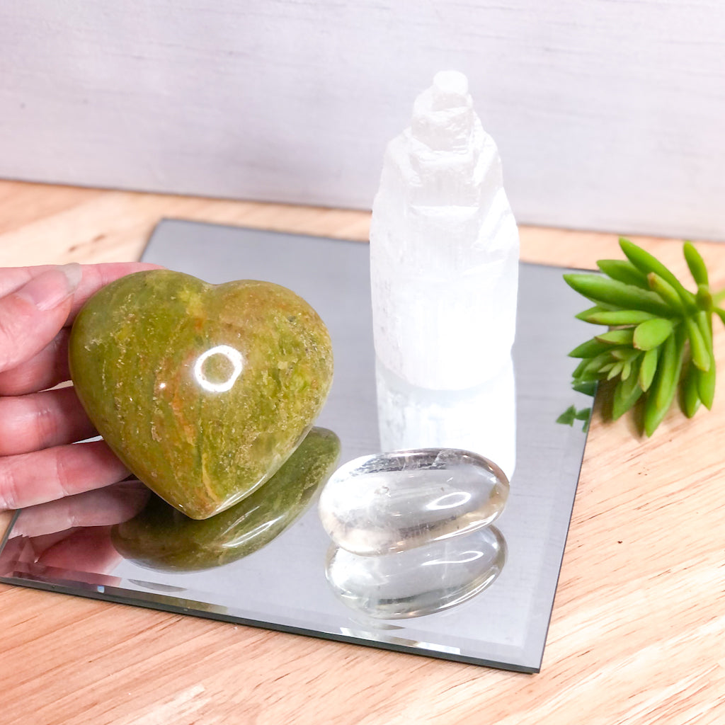 - Green opal big puffy heart - to allow you to invite happiness into your heart. Heals and harmonizes your emotions, it supports letting go and moving on. Green Opal encourages healthy relationships and brings one into awareness for opportunities and good fortune. This is a “feel good” stone, it revitalizes and stabilizes the Heart Chakra.