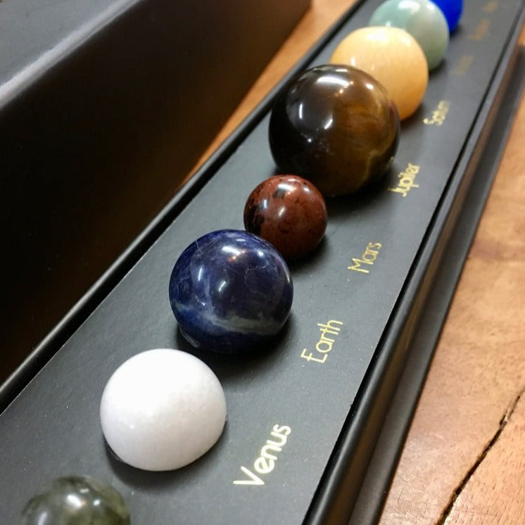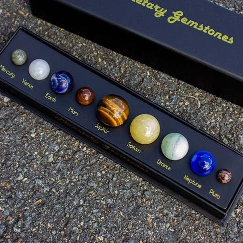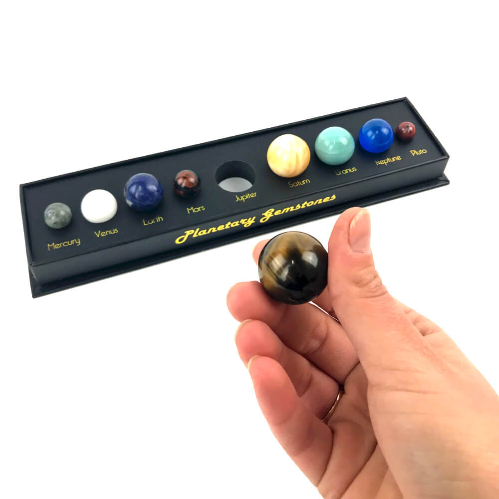 Solar System planetary crystal collection makes for a unique home decoration that can be used as a teaching tool or just to look at. Place it on a shelf, on a desk in an office, or in a solar system themed room. This set includes nine planets crafted from gemstones. Each planet is in ratio sized based on the real planets, from the giant Jupiter to tiny little (barely even a planet) Pluto. The planets sit in the right order with the type of crystal matching the make up of the planet.