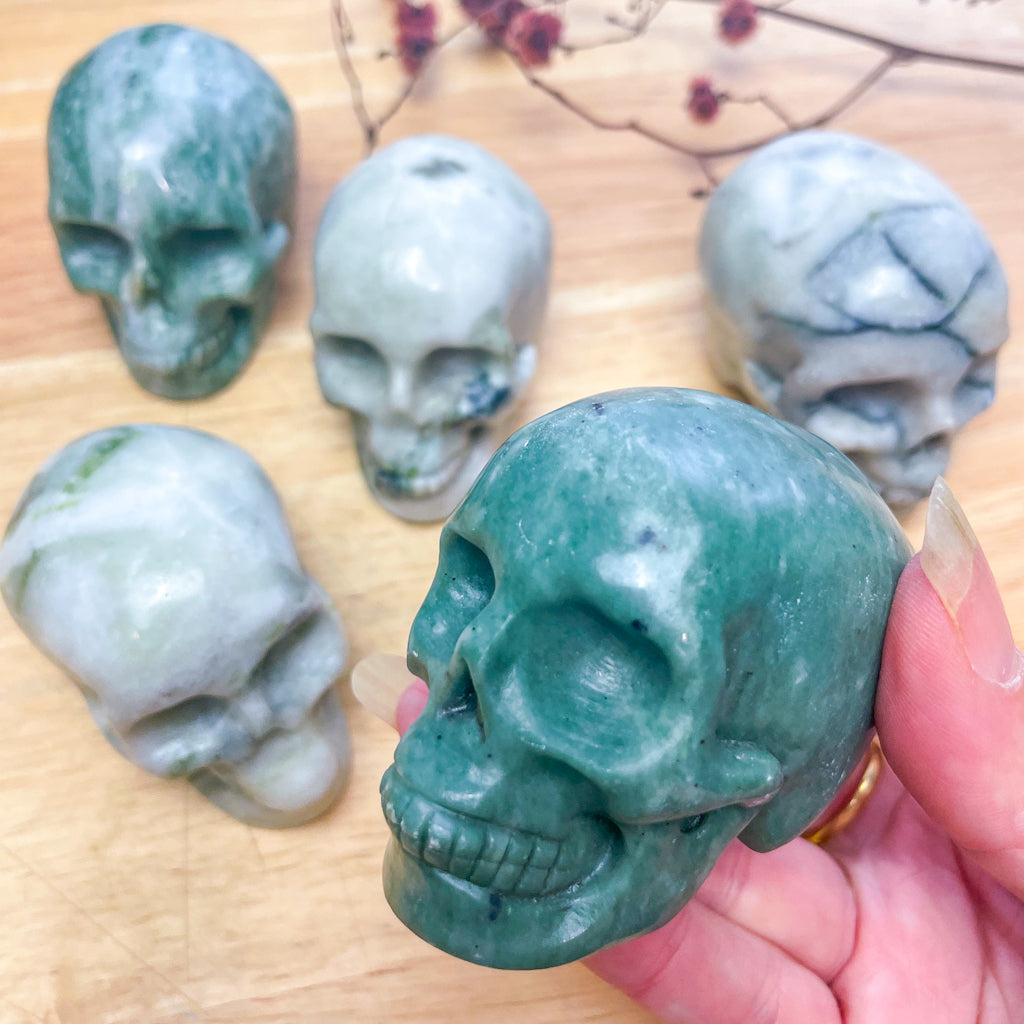 Green Nephrite Jade skull - Jade is a powerful physical heart healer. It also helps strengthen and soothe the nervous system.