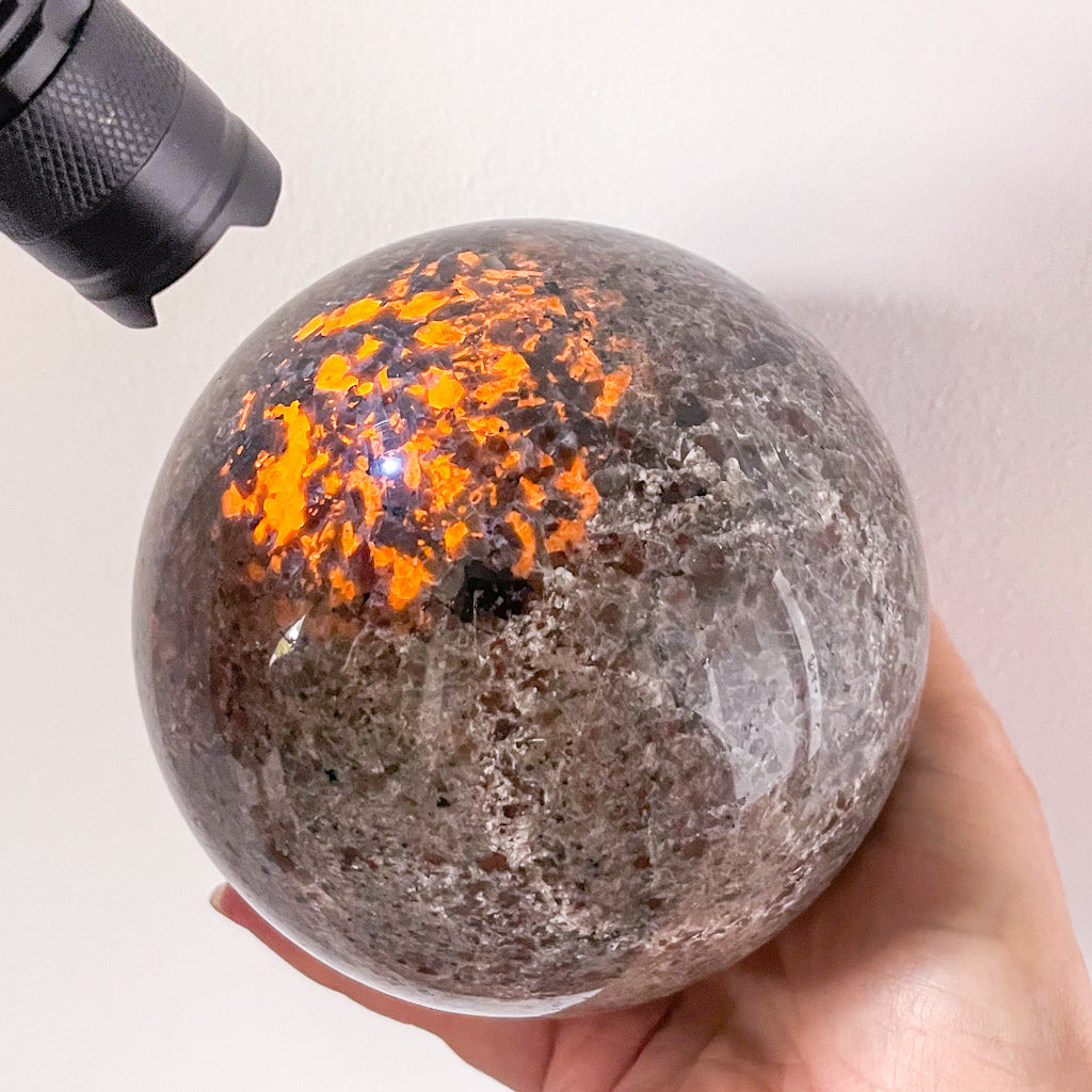 Oh my this crystal sphere looks gorgeous with it's earthy dark grain in natural light... but shine a UV light on it and it'll glow orange and pink!