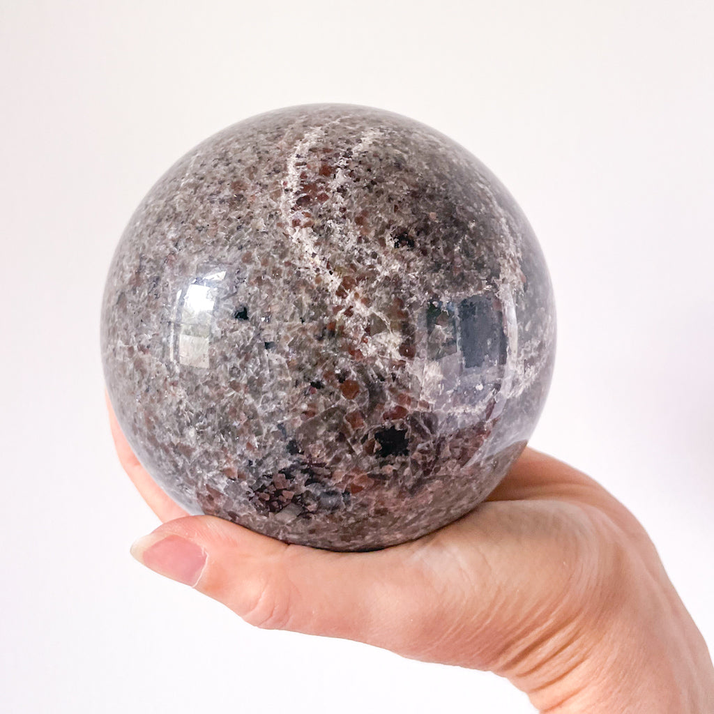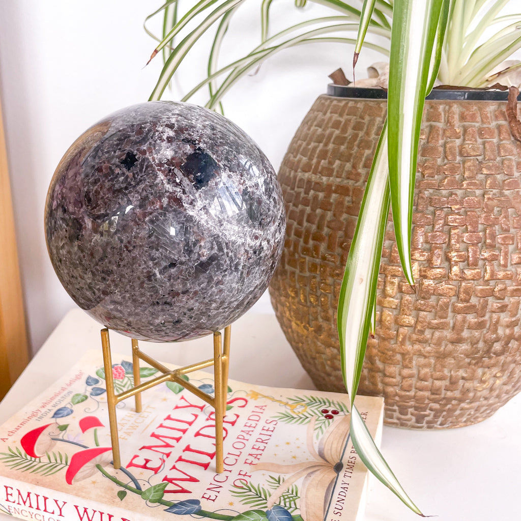 Purchase Crystal UV reactive Yooperlite polished XL sphere with gold stand online now from Six things shop Australia.