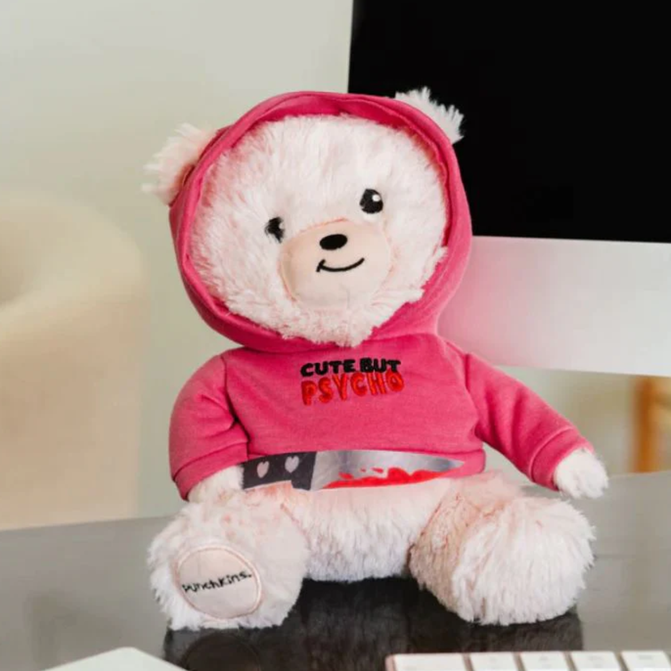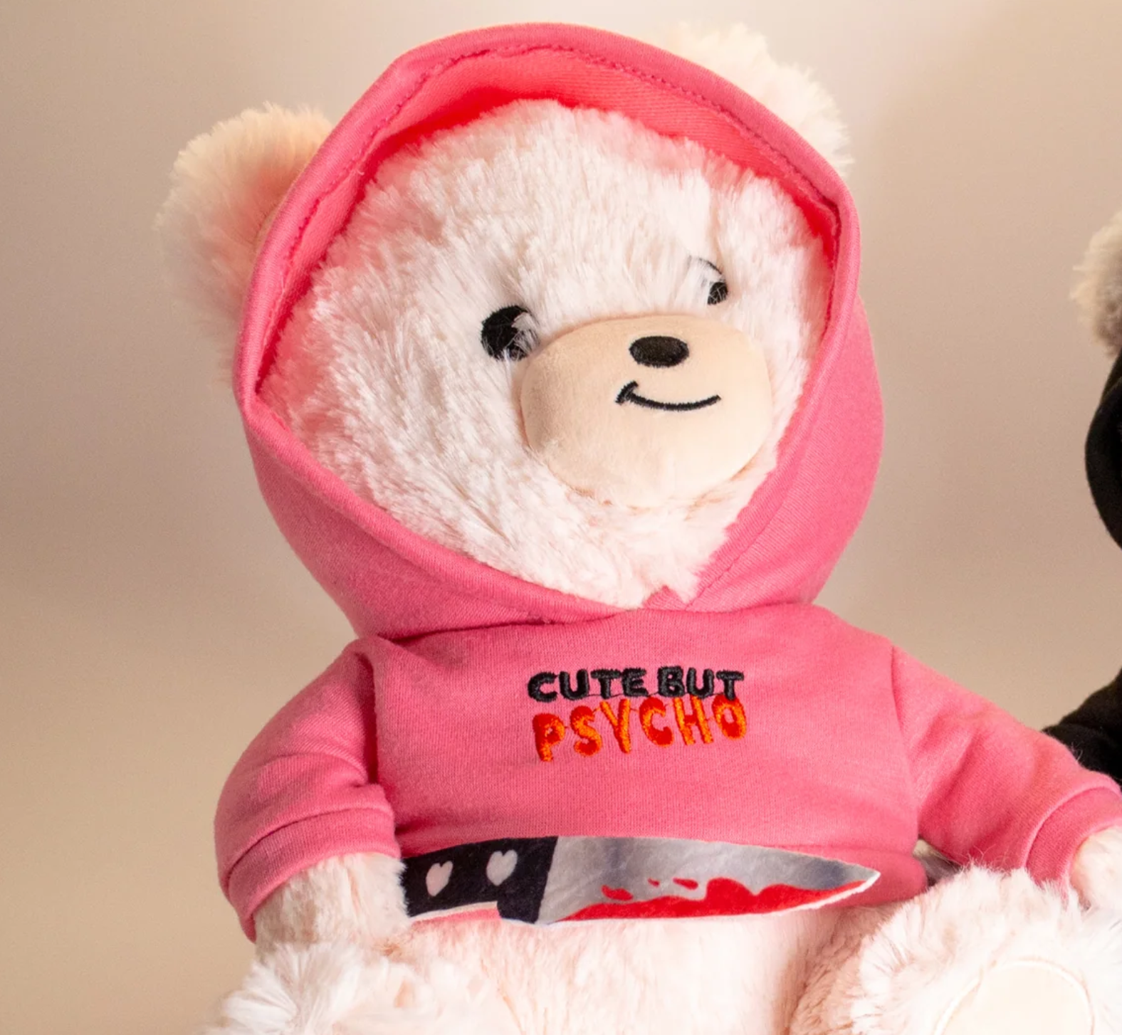 With a bloody knife in her hand and her hoodie on you know she's cute but psycho. This teddy plush toy is a great gift for you know who.