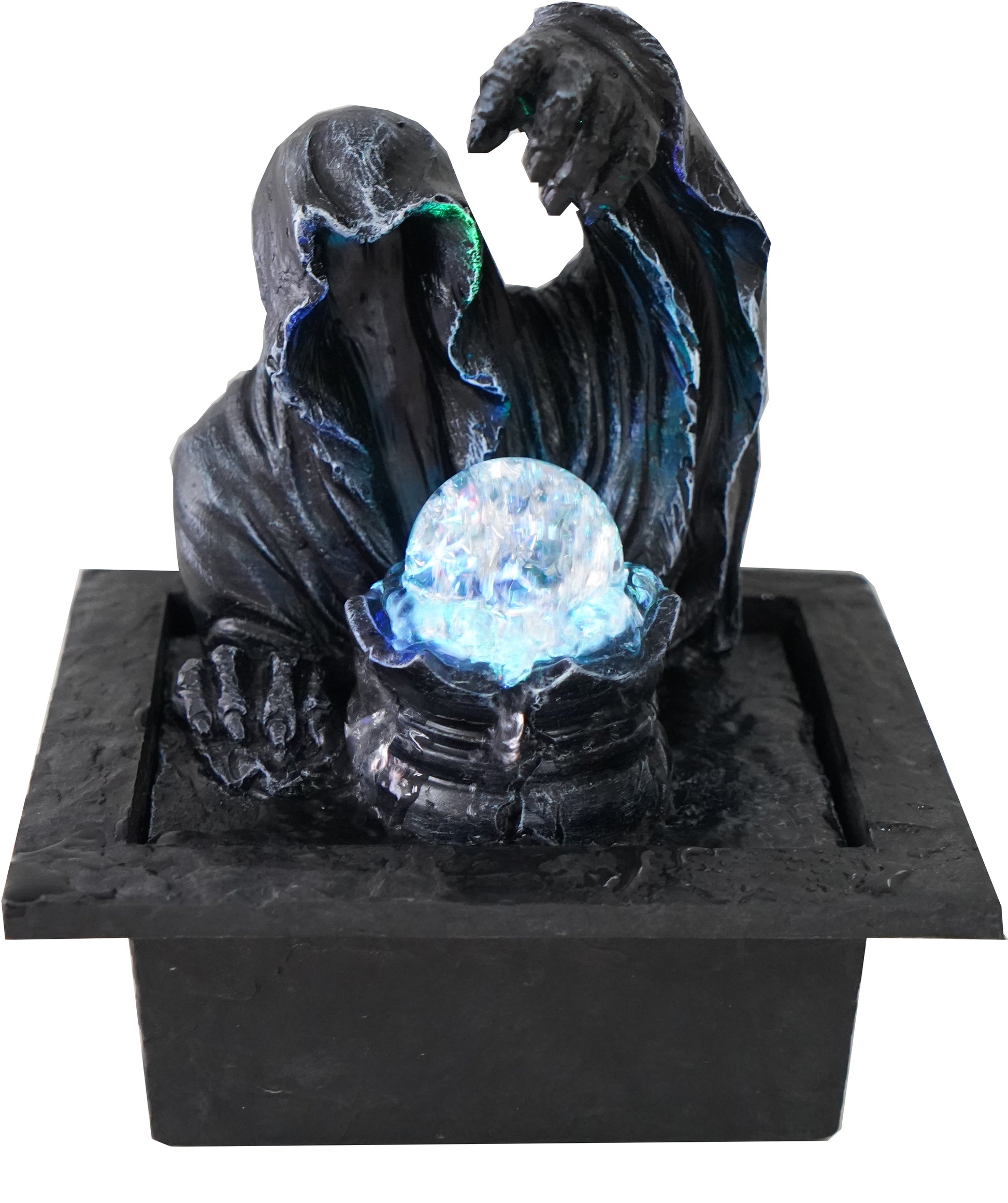 Add a fun to your decor with this water feature. Trickling water, grim reaper / death, what more could you ask for? Lights! Hell yes. How cool is this. Yes a wee bit gaudy but oh so freaking cool. The ultimate for your man cave.