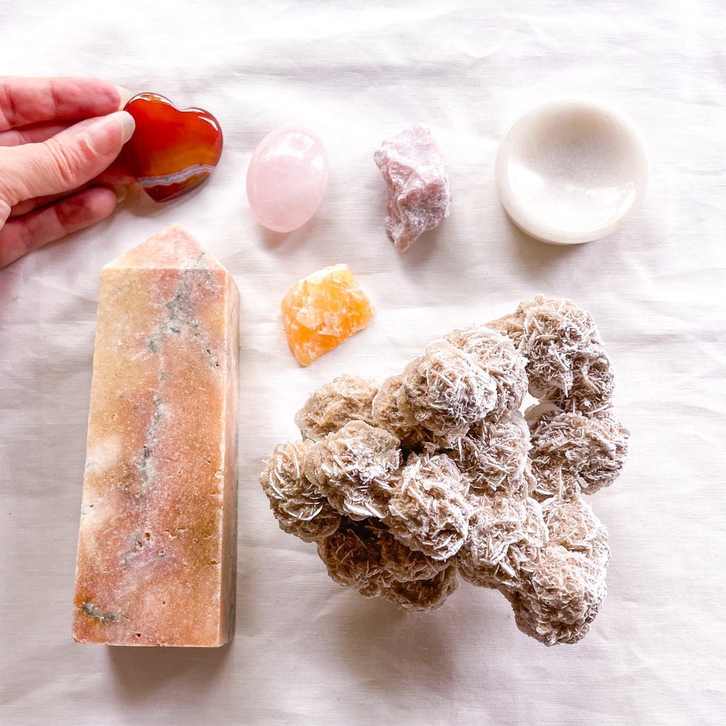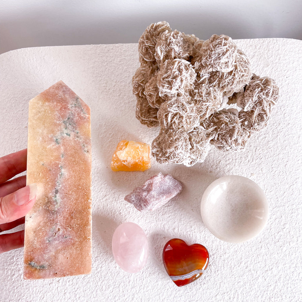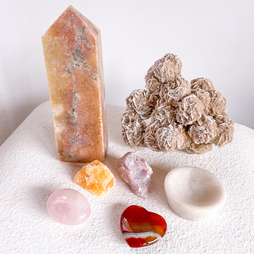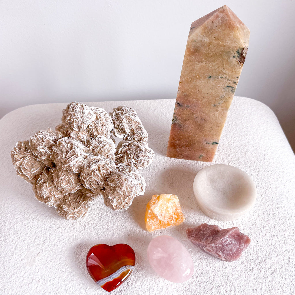 This crystal set includes 7 crystals in a gift box: Pink amethyst extra large point tower, Extra large desert rose cluster, Rose quartz crystal palm stone, Carnelian heart, Onyx crystal ring bowl, pink opal raw and orange calcite raw crystal.