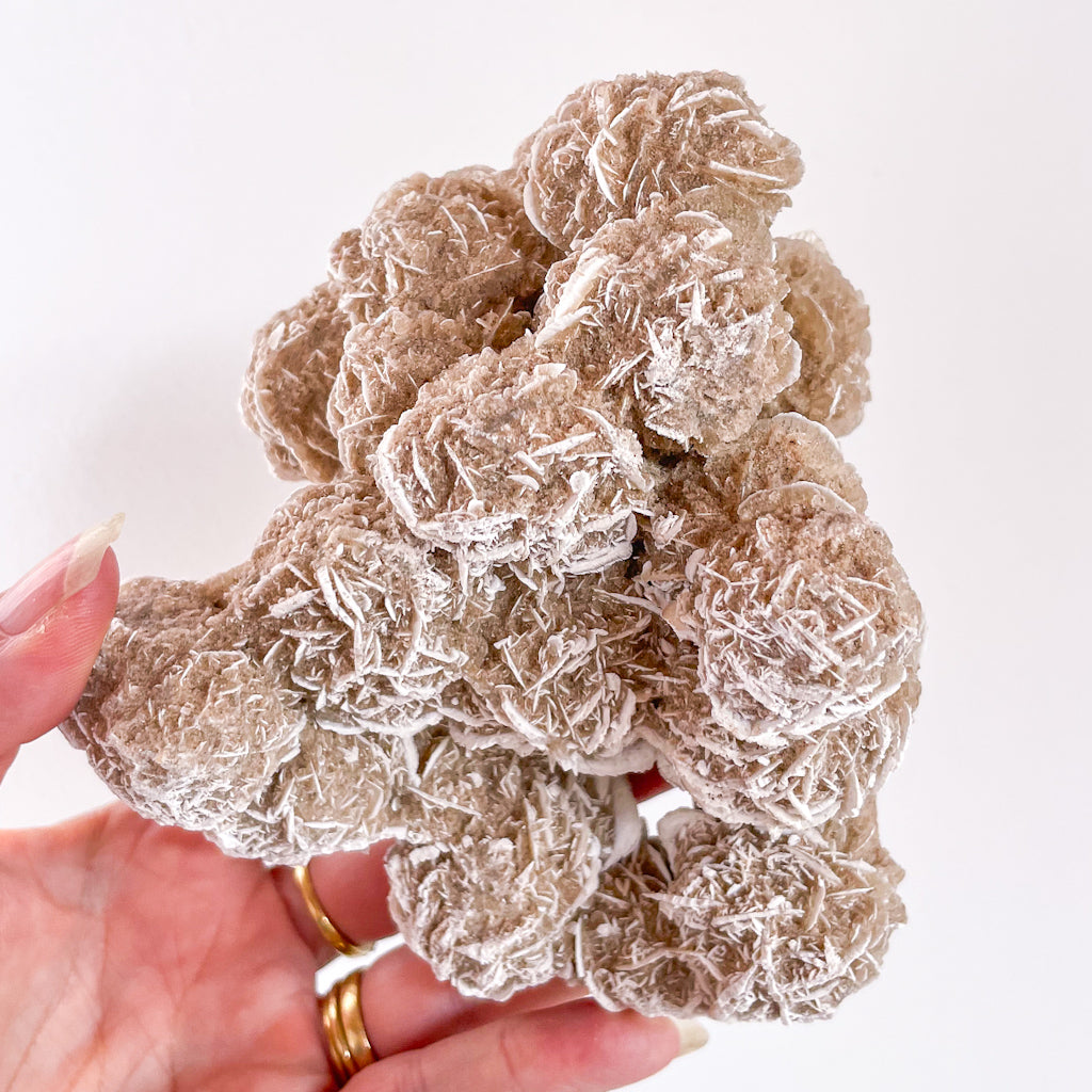 Desert rose crystal cluster - a cluster of flower-like selenite balls that has been slowly etched by the desert sand. This soft crystal contains layers and layers of “petals” resembling a delicate, blooming rose. Brings clarity to an overworked mind and increases confidence to help you embrace your full potential. Place in the living space of your home to create a peaceful, safe environment. Having a Desert Rose cluster at home, or in the office, can help to remove energy blockages. This crystal will be a reminder to be strong in your decision-making, and aid in bringing prosperity.