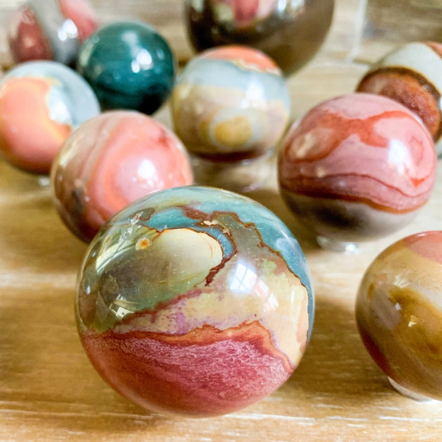 These polychrome jasper / desert jasper crystal spheres are a beautiful earthy coloured crystal with patterns.