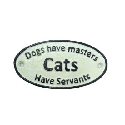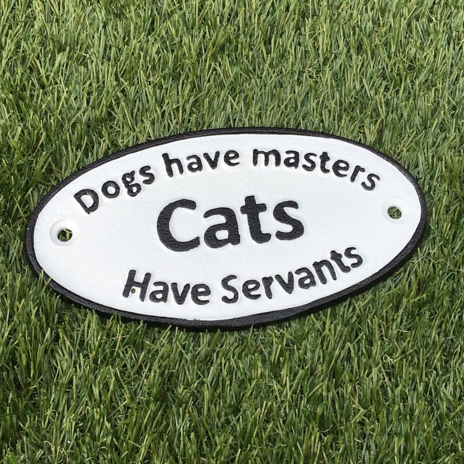The funniest cast iron sign for your home. Dogs have masters, Cats have servants. Coz y'all know it's the cat whose really the boss ;)