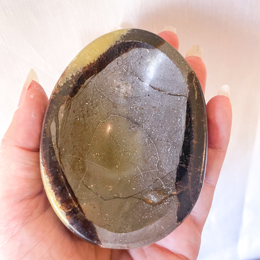 A Mythical crystal that looks like a dragon egg. Caramel and chocolate coloured crystal with a polished  smooth crackled patterned outer shell. These slightly odd shaped spheres are made of Septarian nodule crystal. Grounding and protective, these crystals are like having your own dragon to ward off negative forces.