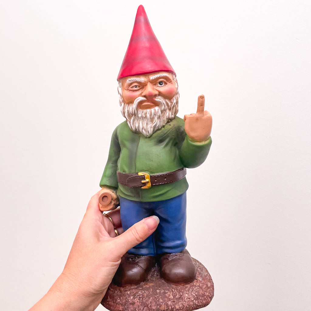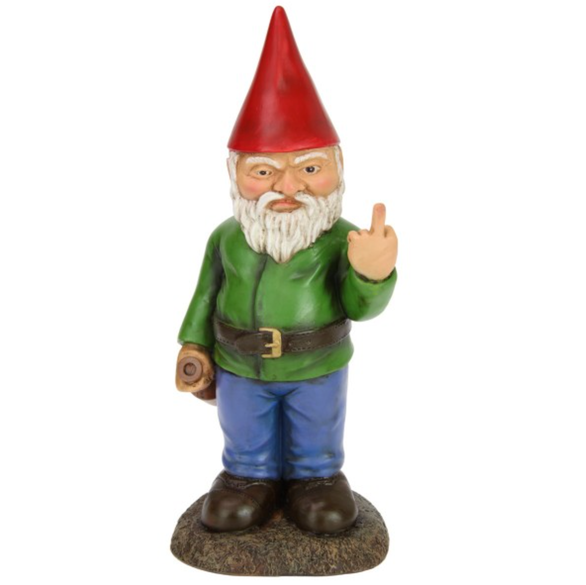 This little guy will look great on your lawn, in the house or even at the office. Go away, the grumpiest of garden gnomes giving everyone the bird for you.