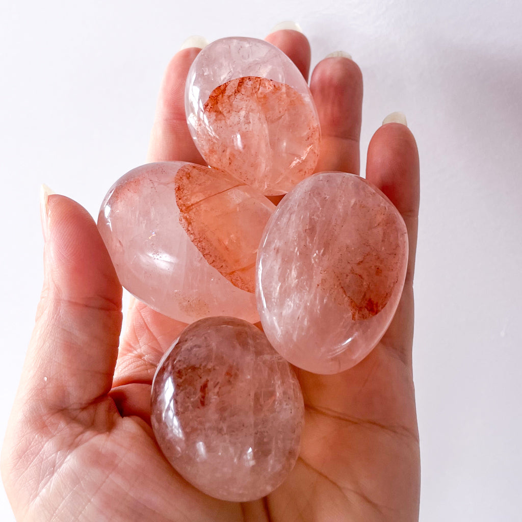 Fire Quartz from Madagascar are lovely polished stones, clear quartz with a few red, reddish brown, or pinkish inclusions of hematite iron. Grounding and stabilising Hematoid Fire Quartz is a really beneficial healing stone.