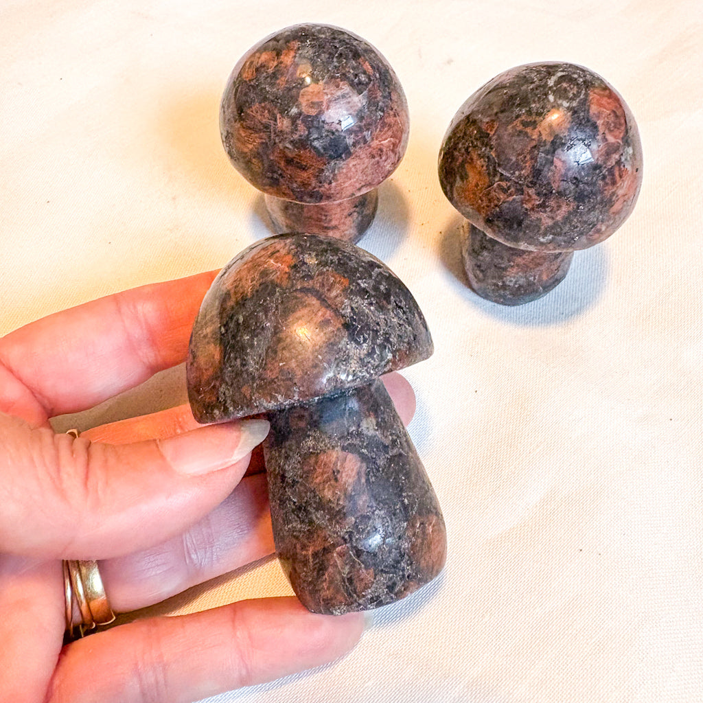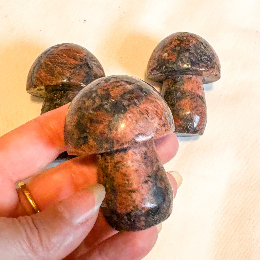 These mushroom carvings are so cute! The mushroom is a symbol for kundalini energy and enlightenment. The stalk represents the spine and the little cap at the top of the stalk represents the opened crown chakra. Mushrooms are also a symbol of good luck and good fortune! They would look great in your favourite house plant or succulent, an altar or sacred space or a fairy garden.