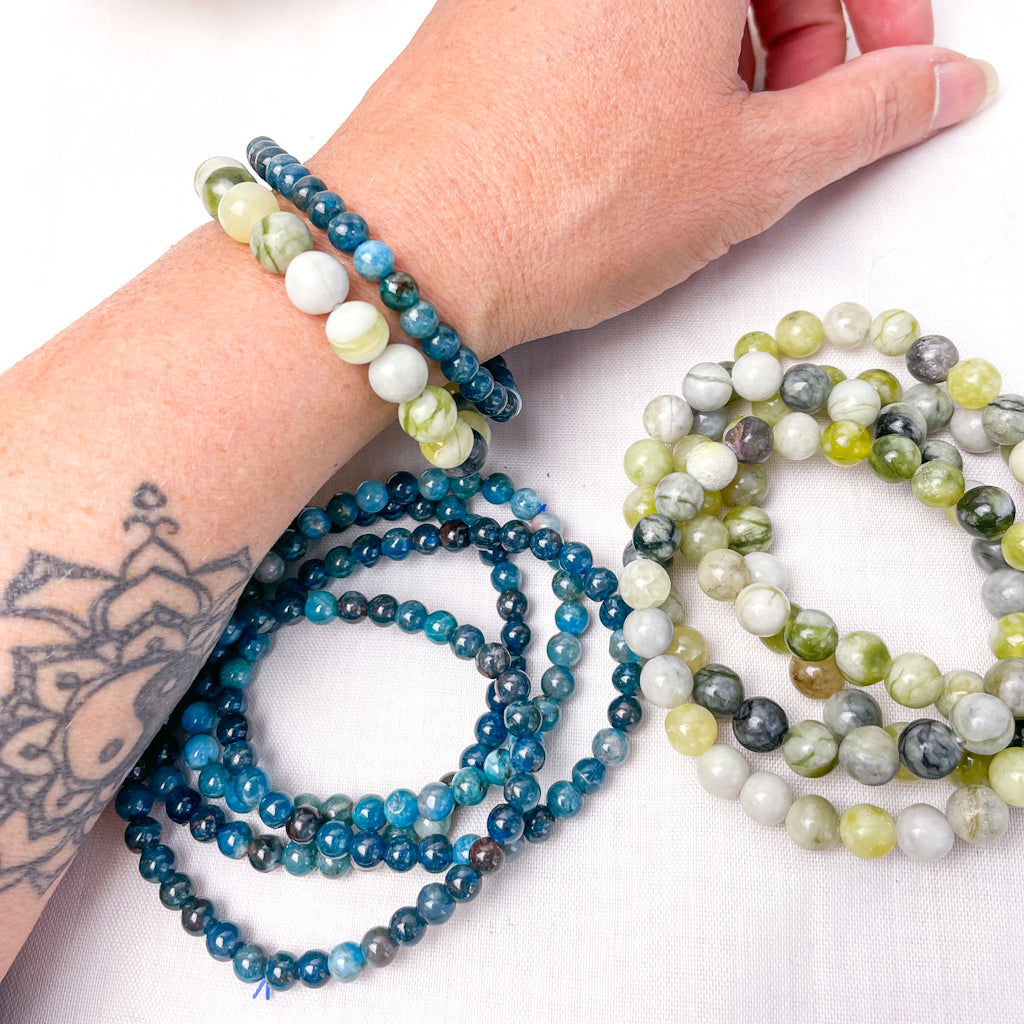 Beautiful green and white 8mm crystal bead bracelets and blue 4mm crystal bead bracelets - choose from either green flower serpentine crystal or blue apatite - they look and work well as a pair too.