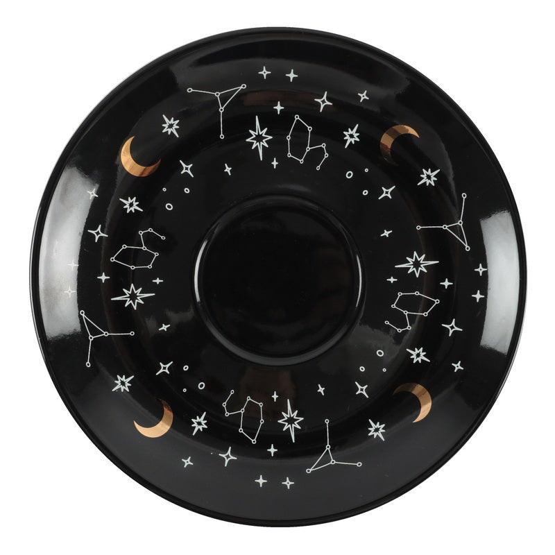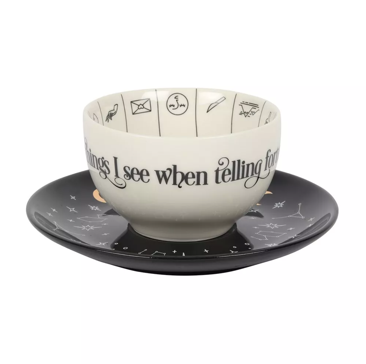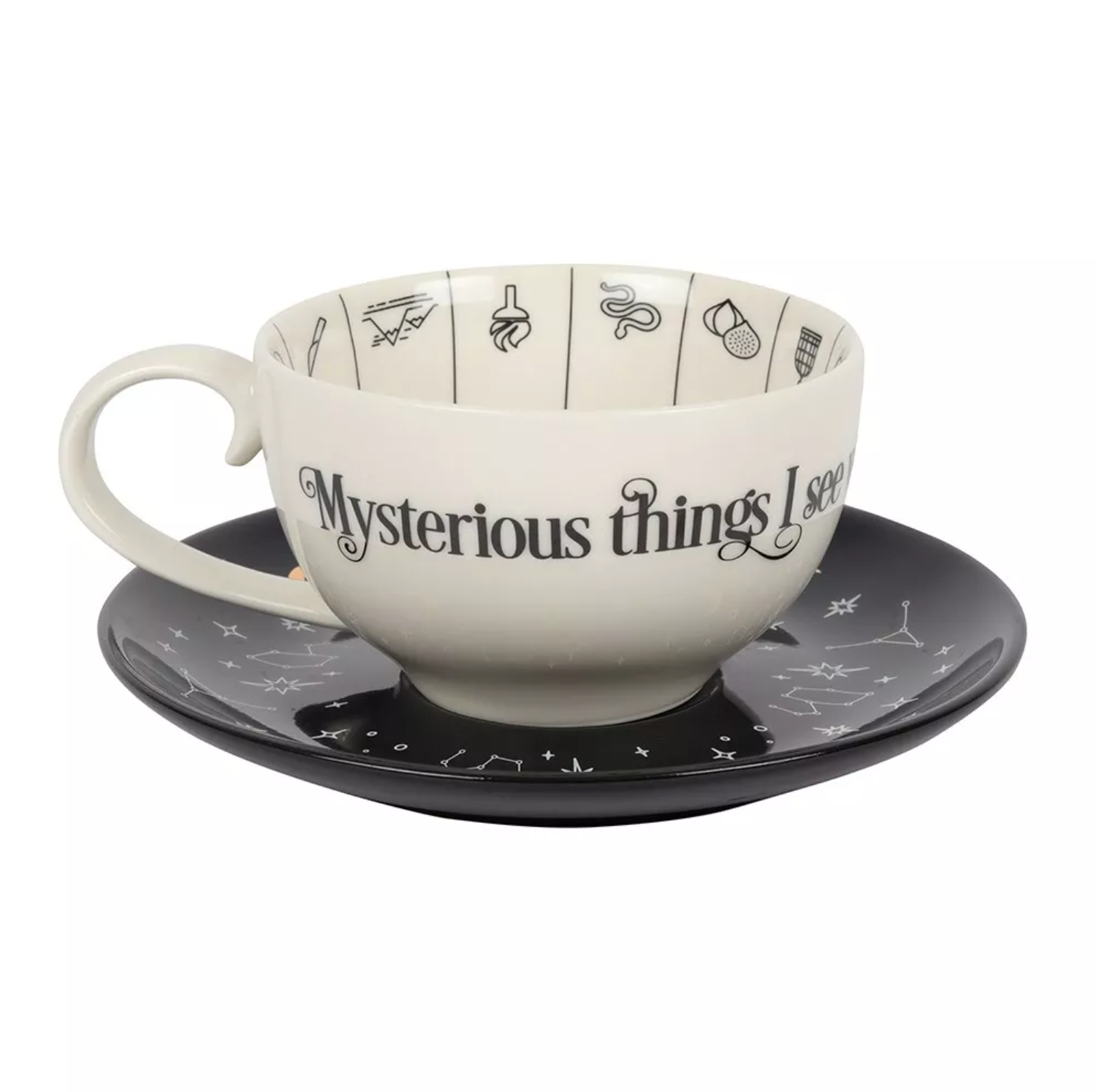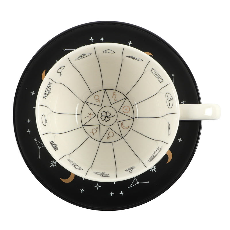 The teacup inside is printed with symbols you may see in the leaves while the outside is printed with the phrase "Mysterious Things I See When Telling Fortunes In Tea". It comes with a contrasting black saucer printed with constellations and gold foil and an instructional leaflet on how to read tea leaves.
