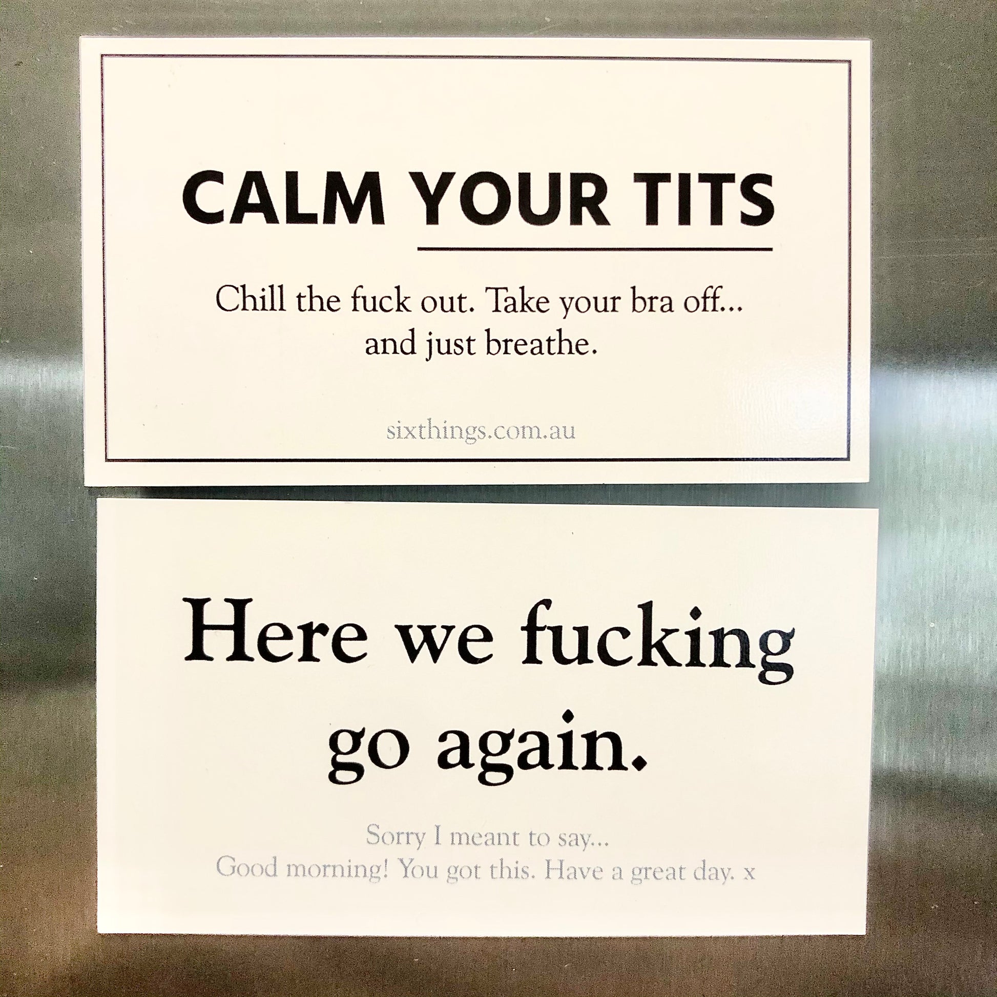 This magnet is totally for you! 4 styles to choose from - love you more than coffee, chocolate, here we fucking go again and calm your tits.