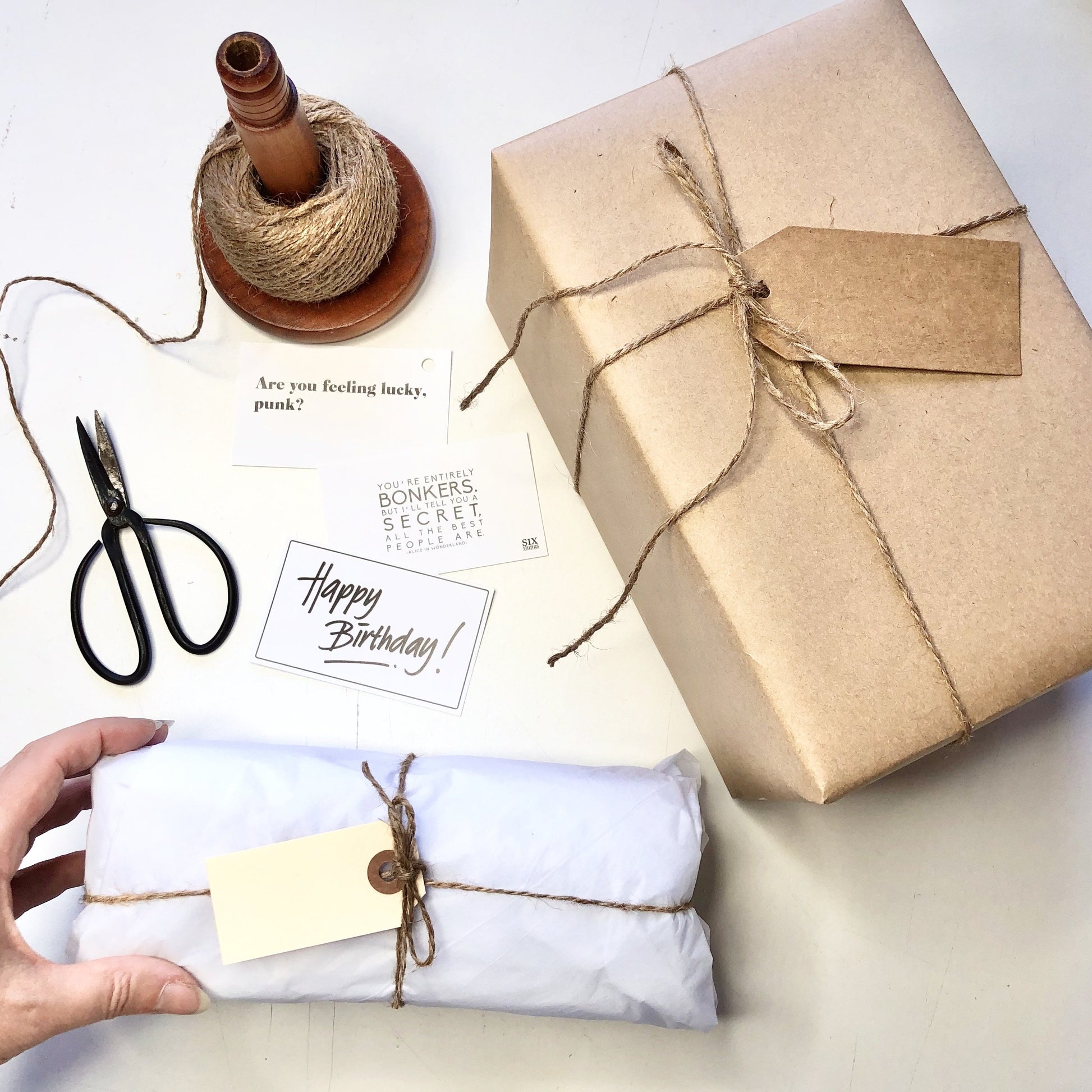 Packages, gifts, presents wrapped in paper and twine with a gift tag. One of our favourite things!