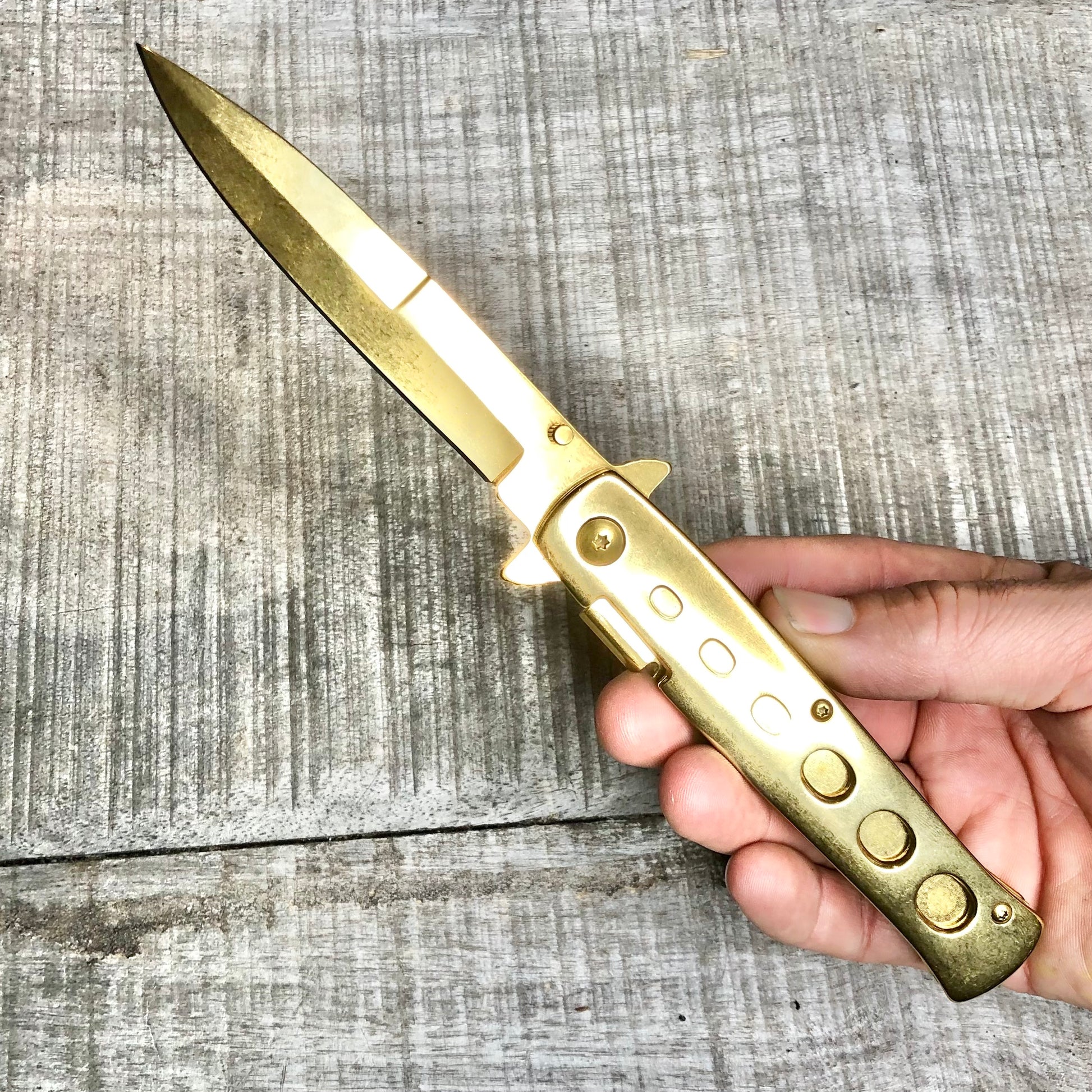Italian godfather style stiletto pocket knife is a great tactical knife to add to your collection. Featuring a stainless steel spear point stiletto gold blade and gold handle, this knife feels great and gets the job done. This golden milano stiletto pocket knife comes with a belt clip for easy carry.