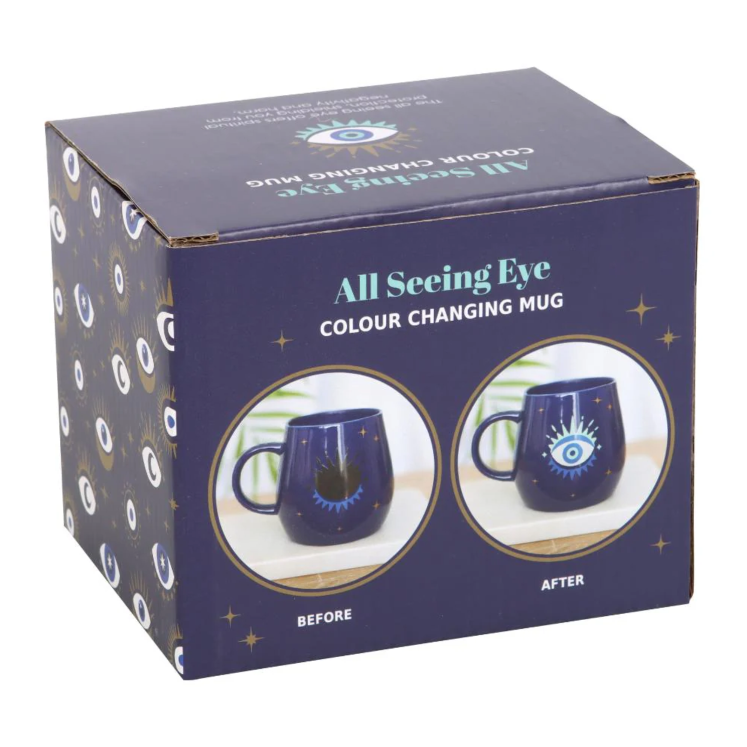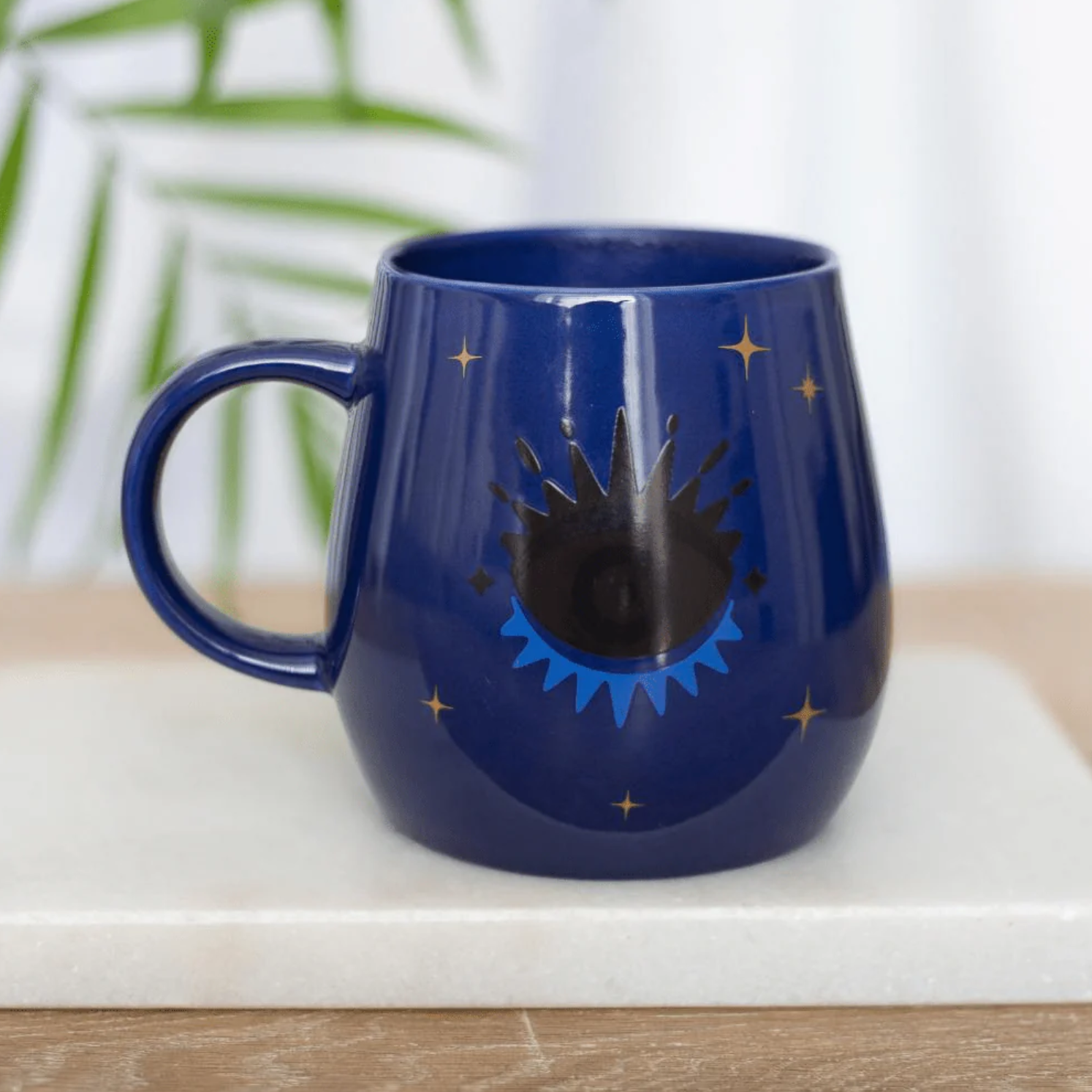 This stunning blue mug, adorned with metallic gold accents, showcases a striking All-Seeing Eye design. Often referred to as the Evil Eye, this symbolic talisman is believed to bring good luck and guard against misfortune. Adding to its charm, the mug reveals a mesmerizing transformation: the eye shifts from closed to open when filled with hot water. Part of the All-Seeing Eye collection of mystical gifts and decor, this unique piece is perfect for those who love a touch of magic in their everyday items.