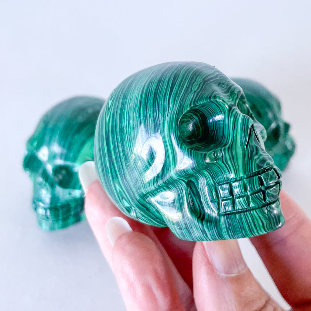 Purchase Rare green malachite hand carved crystal skull online now from Six things shop Australia.