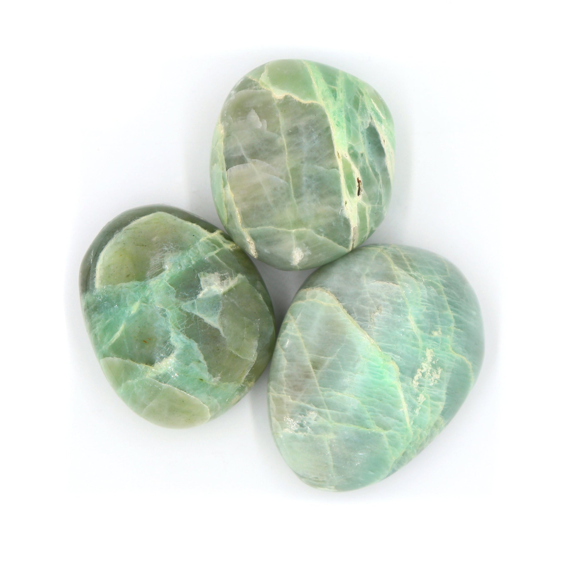 Green Moonstone symbolises mystery, magic, feminine goddess energy, emotional balance, love, and compassion and is associated with the third eye chakra, the heart chakra, and the solar plexus chakra.