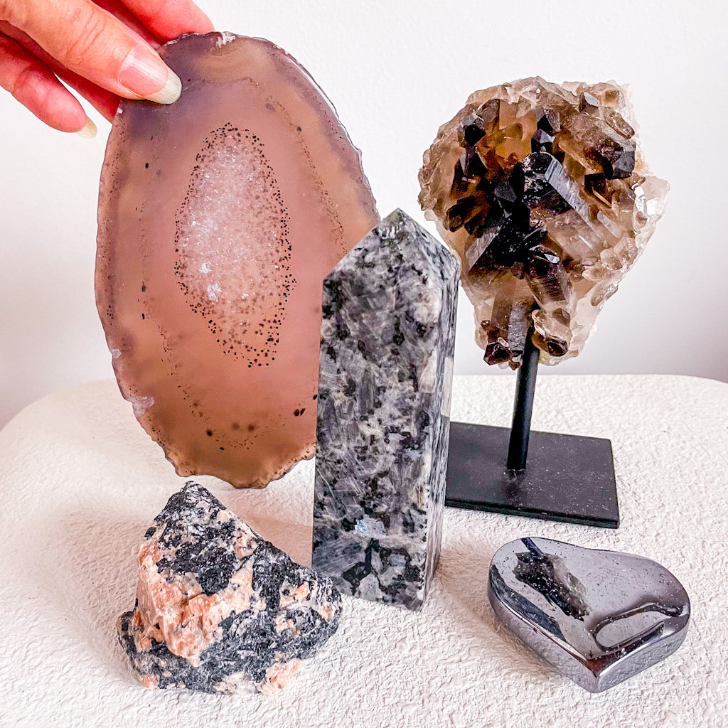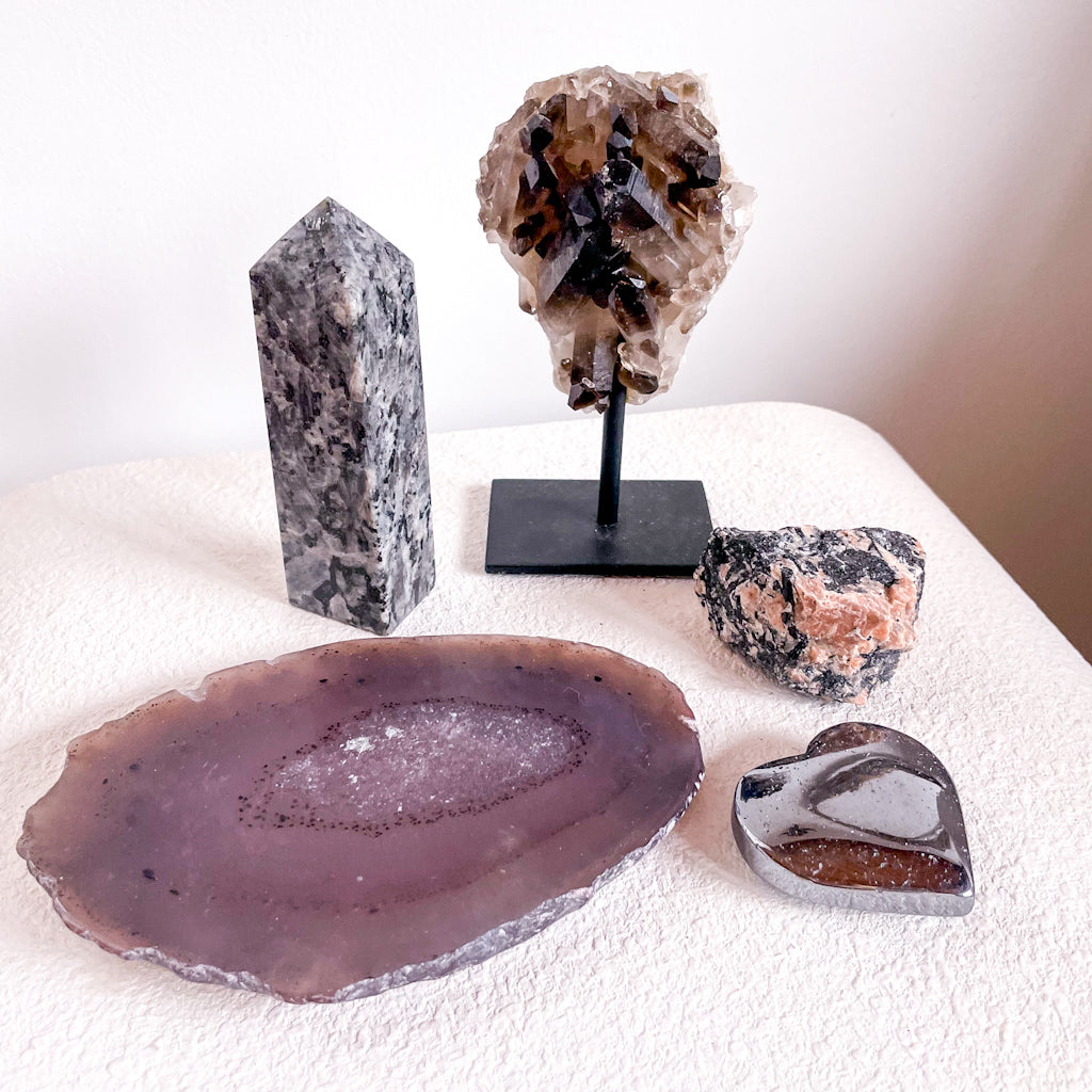 This crystal set includes 5 large crystals in a gift box: Pink opal raw crystal stone, Smoky quartz crystal cluster on metal stand, Agate tray for rings, candle or coaster and rose quartz palm stone and aura jade sphere.