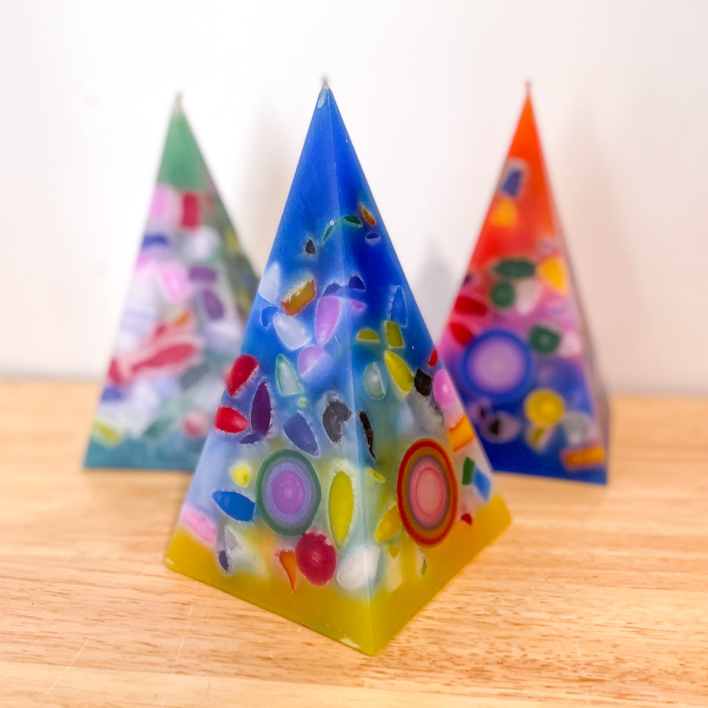 These hand dipped coloured pyramid candles are super fun. These candles burn a within in diameter reservoir. Once they’re a few hours into their burn time, the flame drops within the body of the candle creating a beautiful lantern effect. The light illuminates the colourful features in the candle!