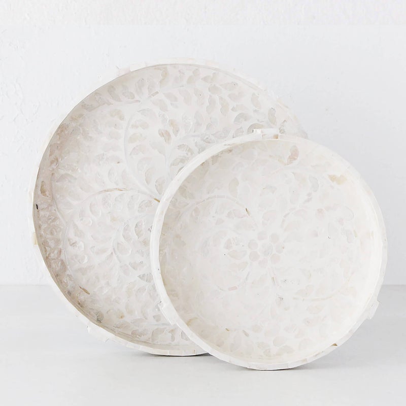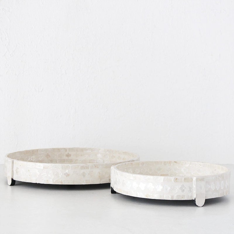 Purchase Handmade capiz shell pearl inlay round tray with feet M-L online now from Six things shop Australia.