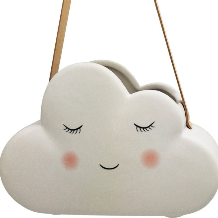 Super cute ceramic hanging planter in white in the shape of a cloud with a cute hand painted face. Adorable for a child's bedroom.