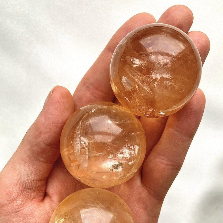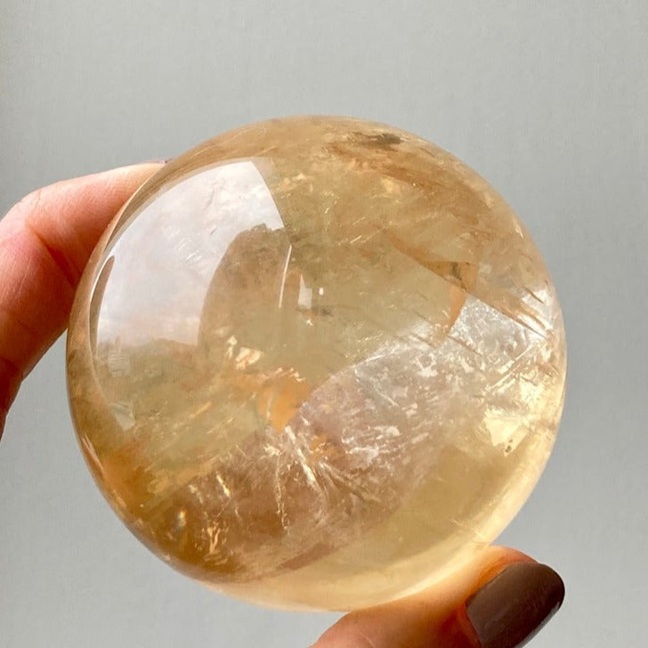 Crystal spheres elegantly display the beautiful qualities of honey calcite crystals. Perfect for your witchy decor or to add sparkly by the window.
