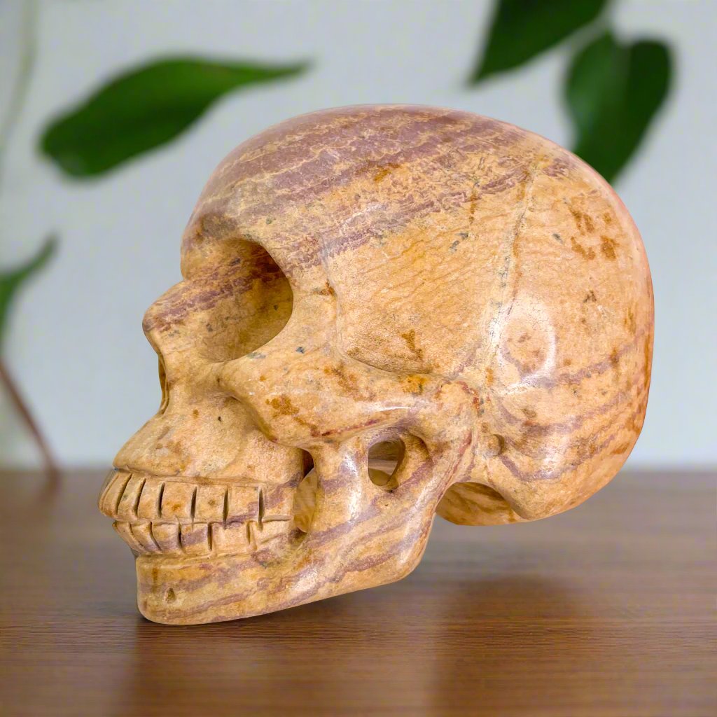 A beautiful piece of jasper crystal in the shape of a skull. Skulls have been used as good luck charms in many cultures as they are believed to ward off illness and guard against evil spirits.