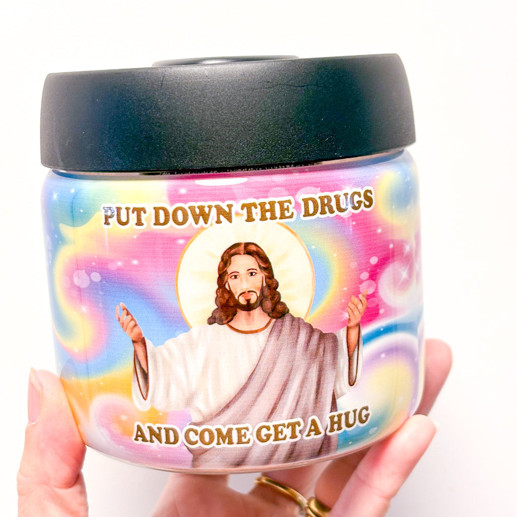 Keep it fresh in this fun storage jar. Put down the drugs and give jesus a hug. Perfect gift for that medical marijuana smoker.