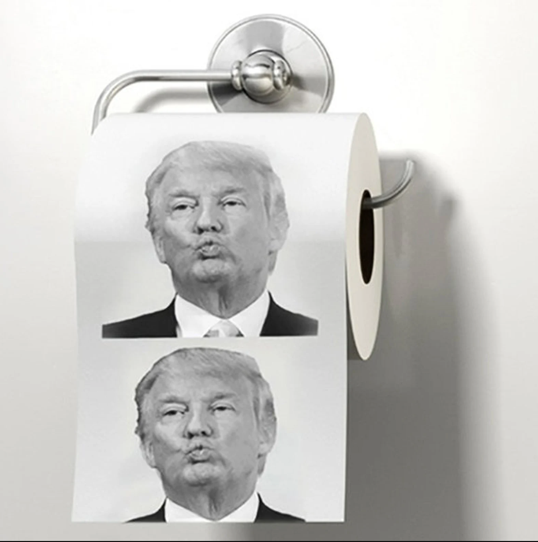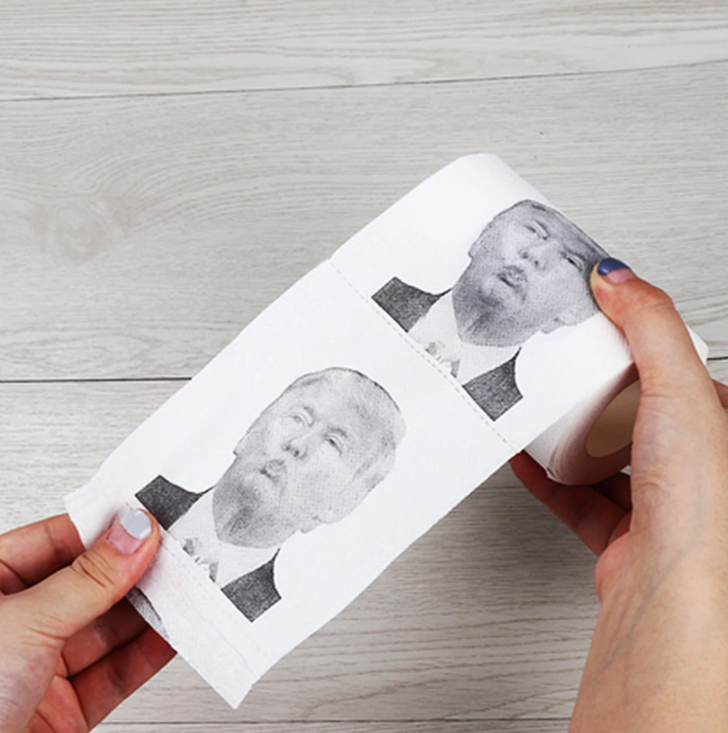 Novelty toilet paper roll that has pictures of Donald Trump so he can kiss your ass.