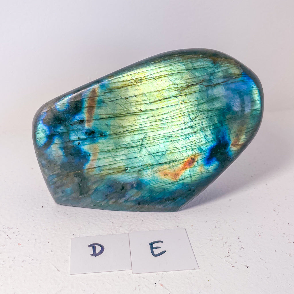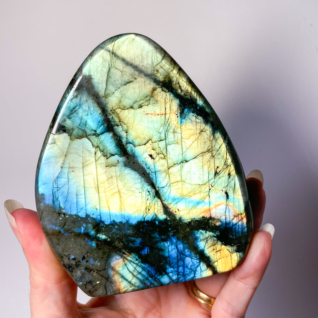 This gorgeous shaped labradorite crystal statue with brilliant flash of peacock colouring will melt your heart with its patterns, colour and beauty.