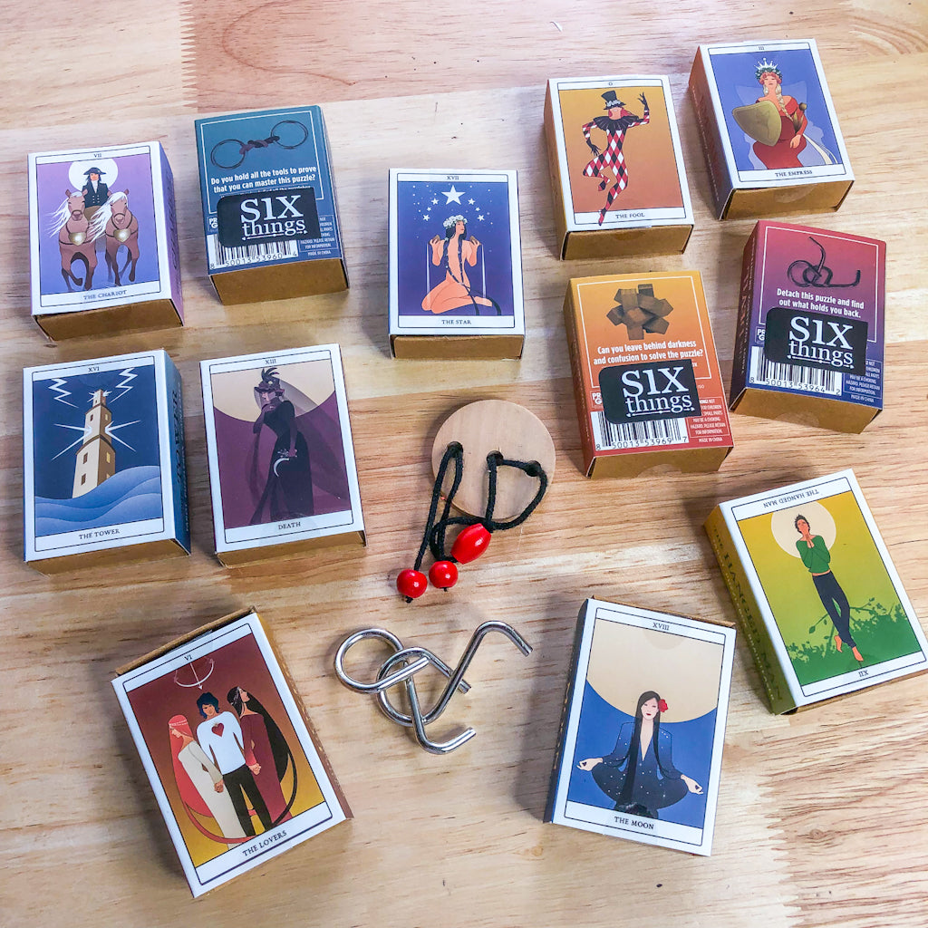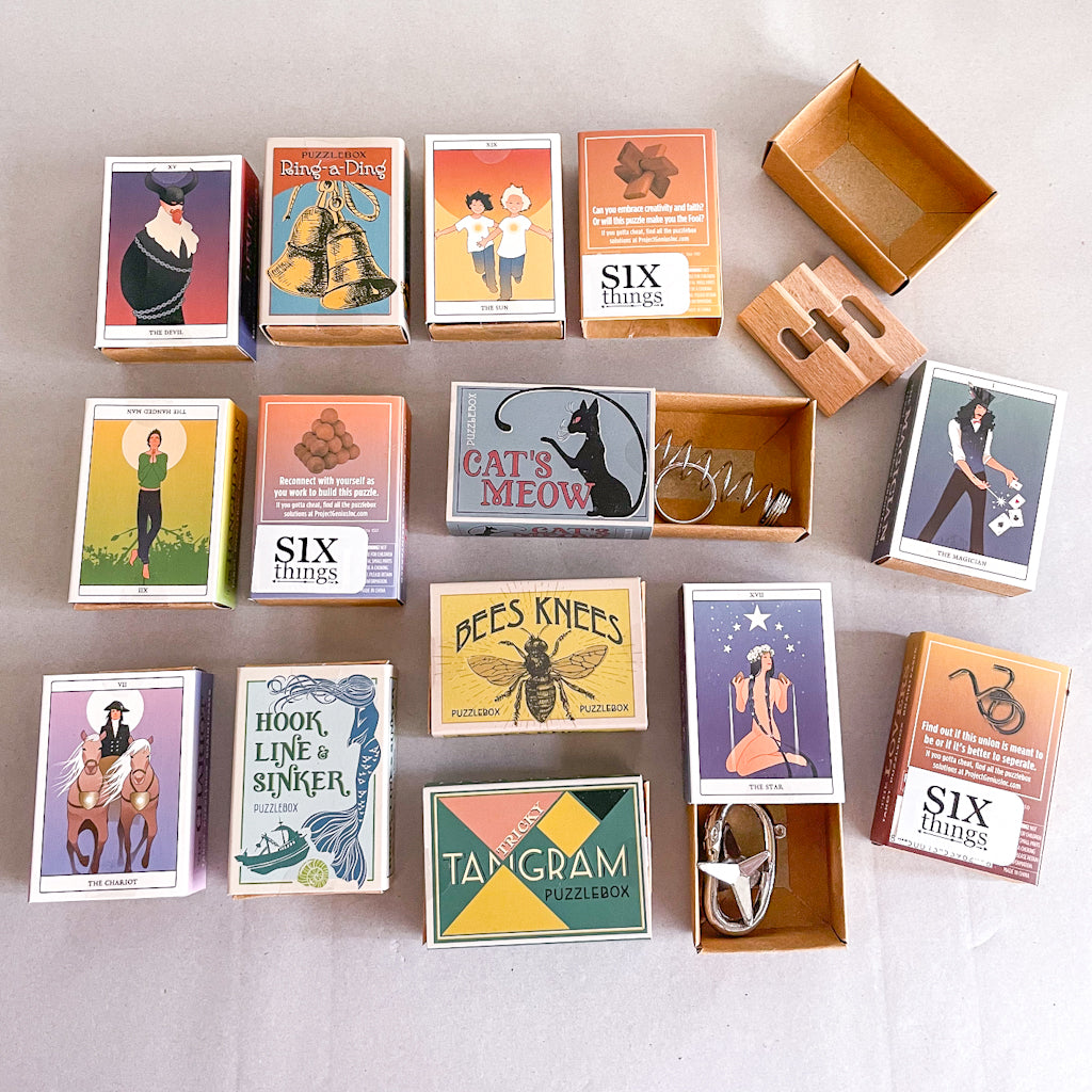 Little boxes of fun! Can you solve the puzzles? The stylish 1920's and tarot card designed boxes... and variety of difficulty levels make these brainteasers a great gift item.